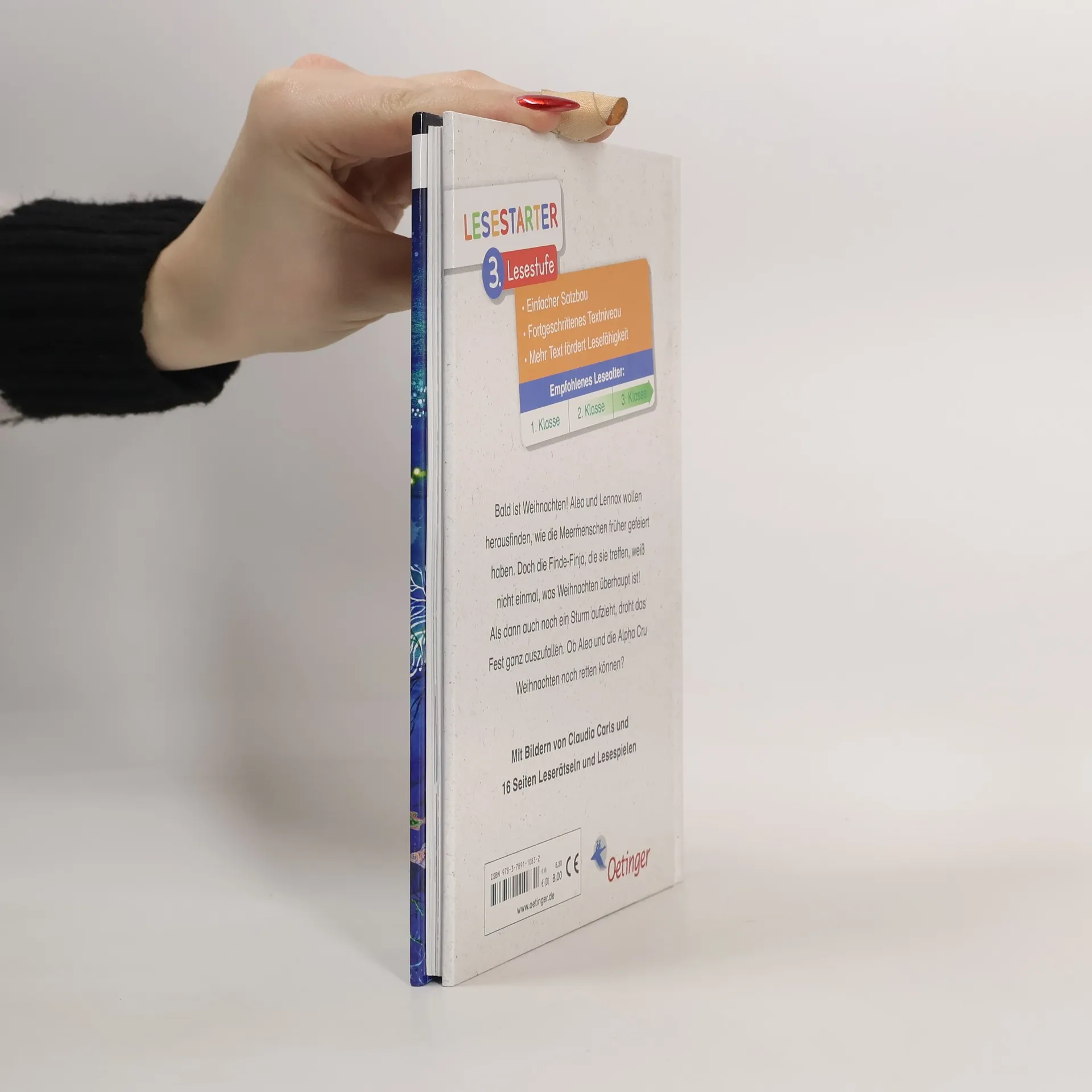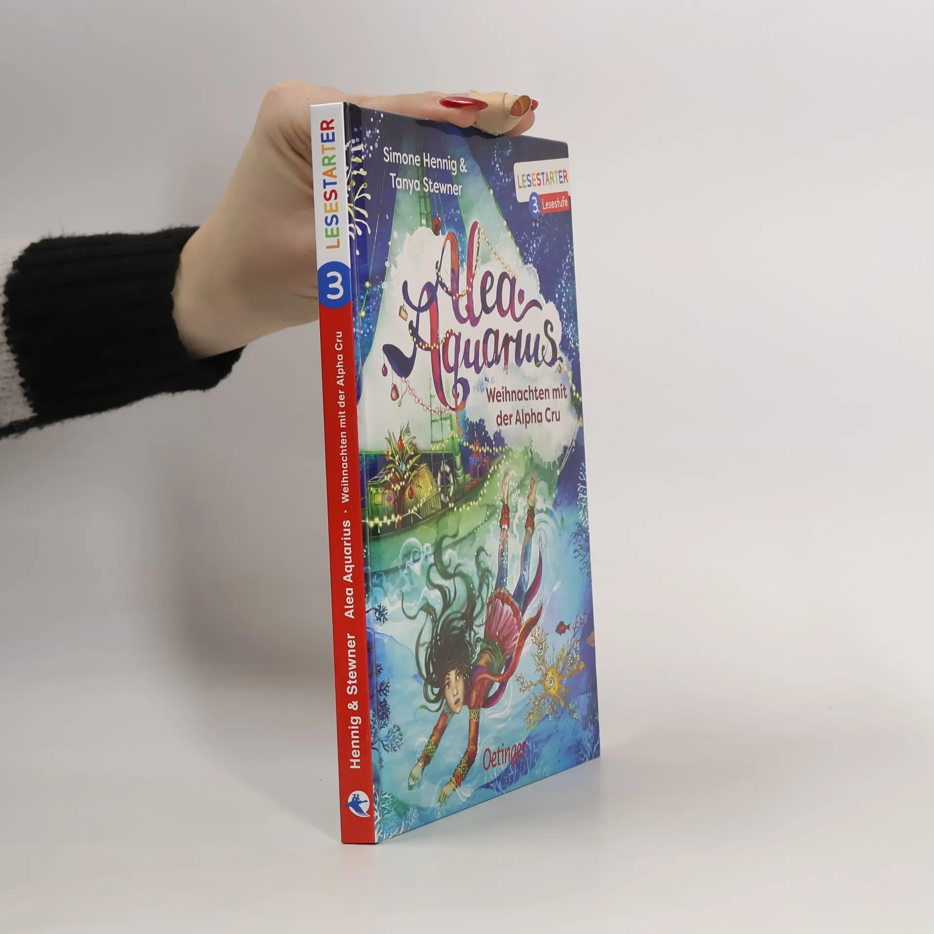 Ihr erstes Weihnachten als Meermädchen will Alea nicht wie eine normale Landgängerin feiern. Gemeinsam mit Lennox sucht sie nach Weihnachtstraditionen unter Wasser und ruft dazu eine Finde-Finja. Die weiß aber gar nicht, was Weihnachten überhaupt ist. Auch Tess‘ Wunsch nach einem Tannenbaum und feiner Käsesuppe erfüllt sich nicht ganz, denn bei einem Auftritt der Band fegt ein Sturm über den Platz und die Alpha Cru hat alle Hände voll zu tun, den umherfliegenden Müll einzufangen, bevor er ins Meer gelangt! Muss Weihnachten nun ins Wasser fallen? Perfekte Vorbereitung auf die „Alea Aquarius“-Kinderbuch-Bestseller-Reihe ab 10 Jahren. Erstlesebuch ab 8 Jahren über Freundschaft, Umweltschutz und das Weihnachtsfest. Rätselteil zum Thema „Umwelt“ vermittelt Extra-Sachwissen. Das zeichnet die Lesestarter der 3. Lesestufe aus: Einfacher Satzbau. Fortgeschrittenes Textniveau. Erhöhter Textanteil fördert die Lesefähigkeit. Gelistet bei Antolin.