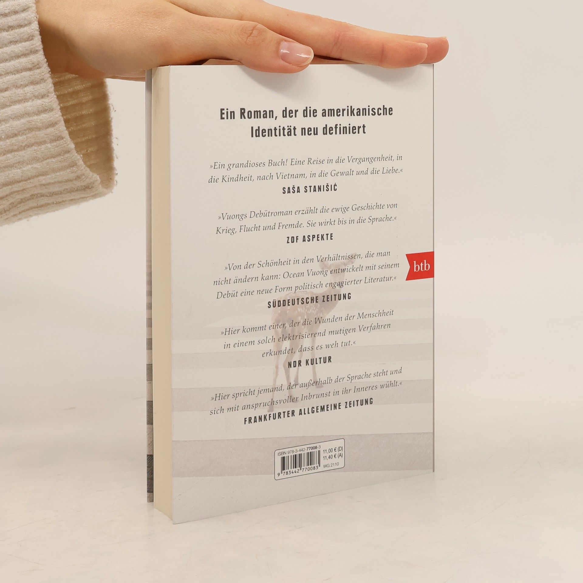 Ein Roman, der die amerikanische Identität neu definiert. Und der Brief eines Sohnes an die vietnamesische Mutter, die ihn nie lesen wird: Die Tochter eines amerikanischen Soldaten und eines vietnamesischen Bauernmädchens ist Analphabetin, kann kaum Englisch und arbeitet in einem Nagelstudio. Sie ist das Produkt eines vergessenen Krieges. Der Sohn, ein schmächtiger Außenseiter, erzählt – von der Krankheit der Großmutter, den geschundenen Händen der prügelnden Mutter und seiner tragischen ersten Liebe zu einem amerikanischen Jungen. Ocean Vuong schreibt mit traumhafter Klarheit von einem Leben, in dem Gewalt und Zartheit aufeinanderprallen.