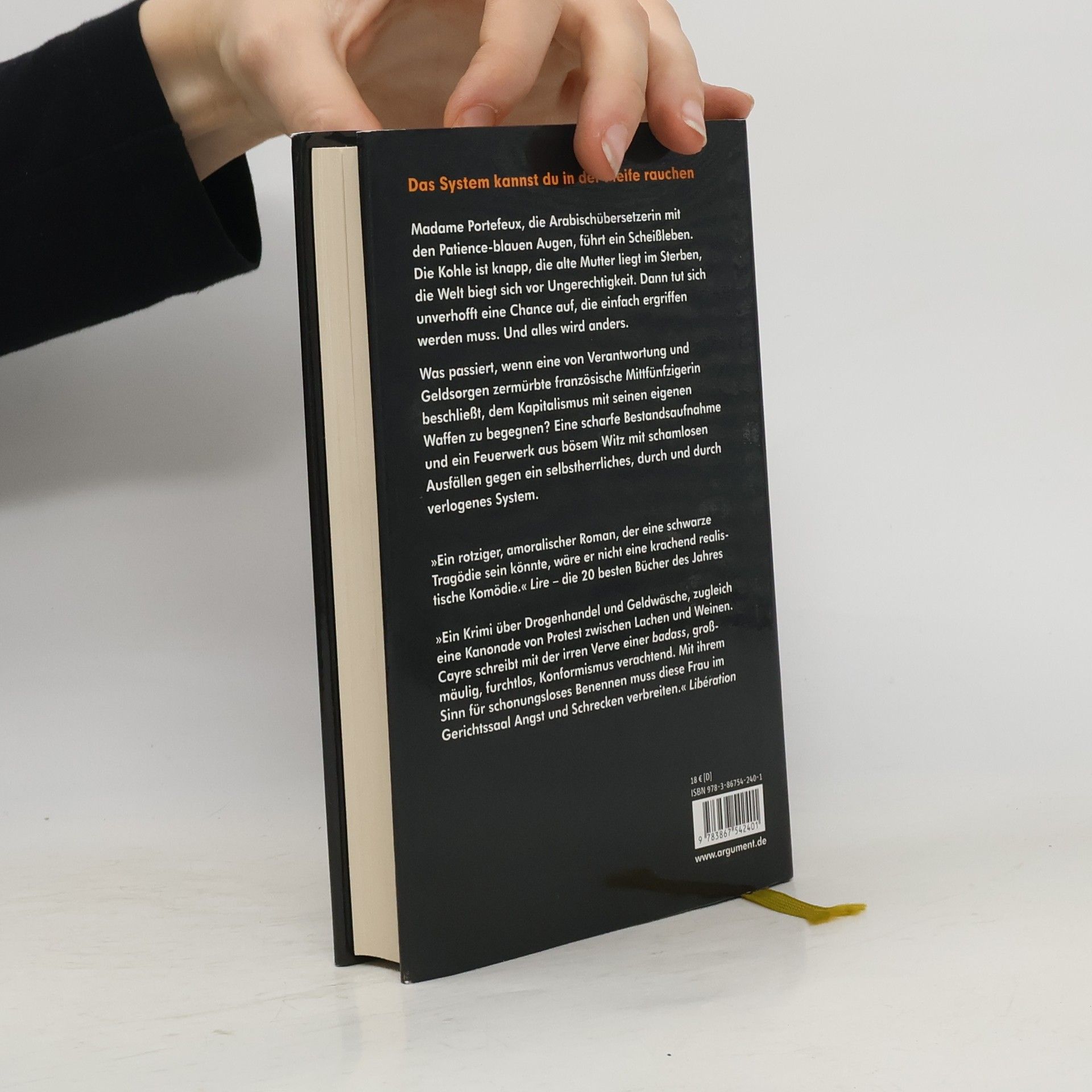 Was passiert, wenn eine von Verantwortung und Geldsorgen zermürbte Mittfünfzigerin beschließt, dem Kapitalismus mit seinen eigenen Waffen zu begegnen? Madame Portefeux, die Arabischübersetzerin mit den Patience-blauen Augen, führt ein Scheißleben. Die Kohle ist knapp, die alte Mutter liegt im Sterben, die Welt biegt sich vor Ungerechtigkeit. Dann tut sich unverhofft eine Chance auf, die einfach ergriffen werden muss. Und alles wird anders … Eine scharfe Bestandsaufnahme und ein Feuerwerk aus bösem Witz: Der Berufswechsel der Justizübersetzerin Patience Portefeux ist eine rasant erzählte Krimikomödie und ein bissiger Kommentar zur Vergangenheit und Gegenwart europäischer Verhältnisse. Patience Portefeux hat die Nase voll und wird von heute auf morgen Die Alte: eine Frau ohne Moral, aber mit Witz und Wut und genug Wissen, um Klischee und Wirklichkeit auseinanderzuhalten.