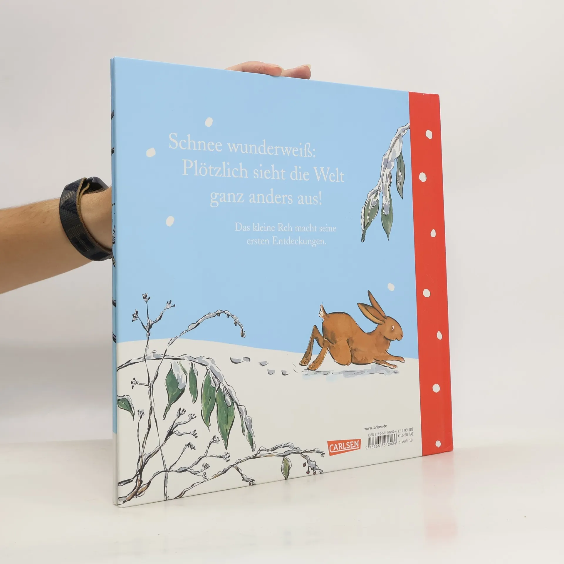 Das kleine Reh staunt: Plötzlich sieht die Welt ganz anders aus! Zögerlich wagt es die ersten Schritte. Mal knirscht es laut, mal leise. Nach einem aufregenden Tag wird es Zeit, nach Hause zu stapfen. Mama und Papa warten schon.