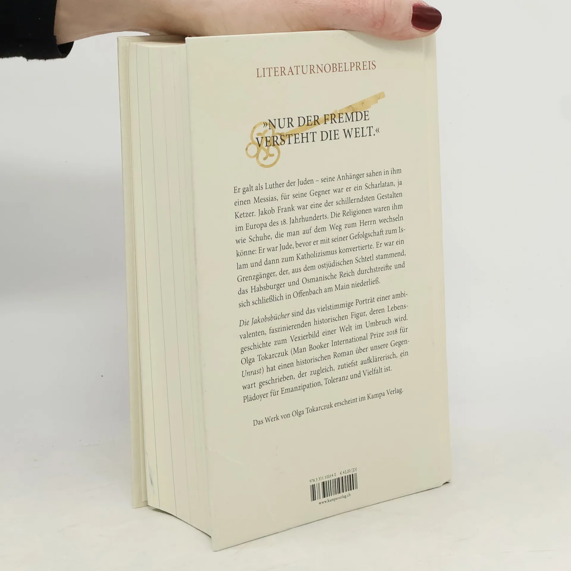 Er galt als Luther der Juden – seine Anhänger sahen in ihm einen Messias, für seine Gegner war er ein Scharlatan, ja Ketzer. Jakob Frank war eine der schillerndsten Gestalten im Europa des 18. Jahrhunderts. Die Religionen waren ihm wie Schuhe, die man auf dem Weg zum Herrn wechseln könne: Er war Jude, bevor er mit seiner Gefolgschaft zum Islam und dann zum Katholizismus konvertierte. Er war ein Grenzgänger, der, aus dem ostjüdischen Schtetl stammend, das Habsburger und das Osmanische Reich durchstreifte und sich schließlich in Offenbach am Main niederließ. »Die Jakobsbücher« sind das vielstimmige Porträt einer faszinierenden Figur, deren Lebensgeschichte zum Vexierbild einer Welt im Umbruch wird. Olga Tokarczuk hat einen historischen Roman über unsere Gegenwart geschrieben, der zugleich ein Plädoyer für Toleranz und Vielfalt ist. Ihr Opus magnum, vom Nobelpreiskomitee explizit in der Begründung erwähnt.