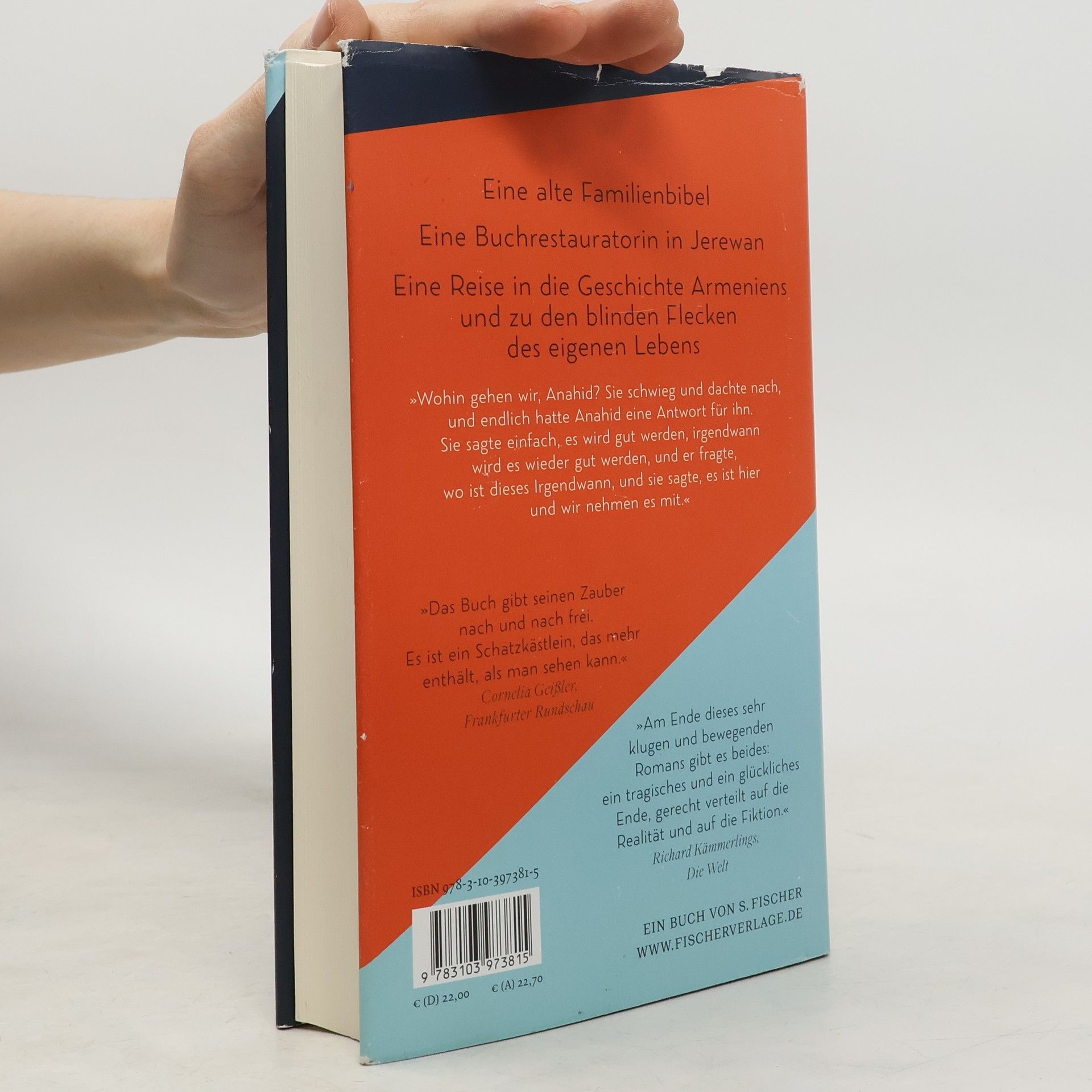Longlist - nominiert für den Deutschen Buchpreis 2019 »Dikranian. Abovyan. Petrosian. Mazavian. Mein Nachname war plötzlich in phonetischer Gesellschaft. Bisher hatte ich ihn getragen wie ein unpassendes Kleidungsstück, wie einen verbeulten Hut, den ich auch zum Essen nicht abnahm.« 1915: Die alte Bibel einer armenischen Familie an der Schwarzmeerküste ist das Einzige, was den Geschwistern Anahid und Hrant auf ihrer Flucht bleibt. Hundert Jahre später in Jerewan wird der Restauratorin Helen eine Bibel anvertraut. »Hrant will nicht aufwachen«, hat jemand an den Rand einer Seite gekritzelt. Helen taucht ein in die Rätsel des alten Buches, in das moderne Armenien und in eine Geschichte vom Exil, vom Verlorengehen und vom Schmerz, der Generationen später noch nachhallt. Und sie bricht auf zu einer Reise an die Schwarzmeerküste und zur anderen Seite des Ararat.