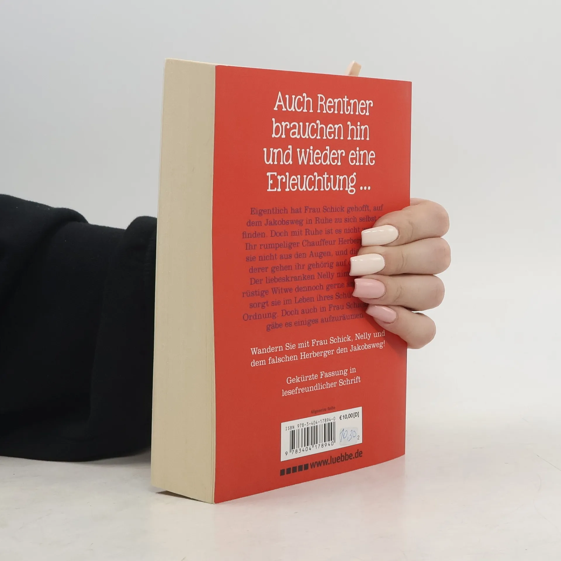 Eigentlich hat Frau Schick gehofft, auf dem Jakobsweg in Ruhe zu sich selbst zu finden. Doch mit Ruhe ist es nicht weit her: Ihr rumpeliger Chauffeur Herberger lässt sie nicht aus den Augen, und die Mitwanderer gehen ihr gehörig auf die Nerven. Der liebeskranken Nelly nimmt sich die rüstige Witwe dennoch gerne an. Energisch sorgt sie im Leben ihres Schützlings für Ordnung. Doch auch in Frau Schicks Leben gäbe es einiges aufzuräumen ... Wandern Sie mit Frau Schick, Nelly und dem falschen Herberger den Jakobsweg! Gekürzte Fassung in lesefreundlicher Schrift