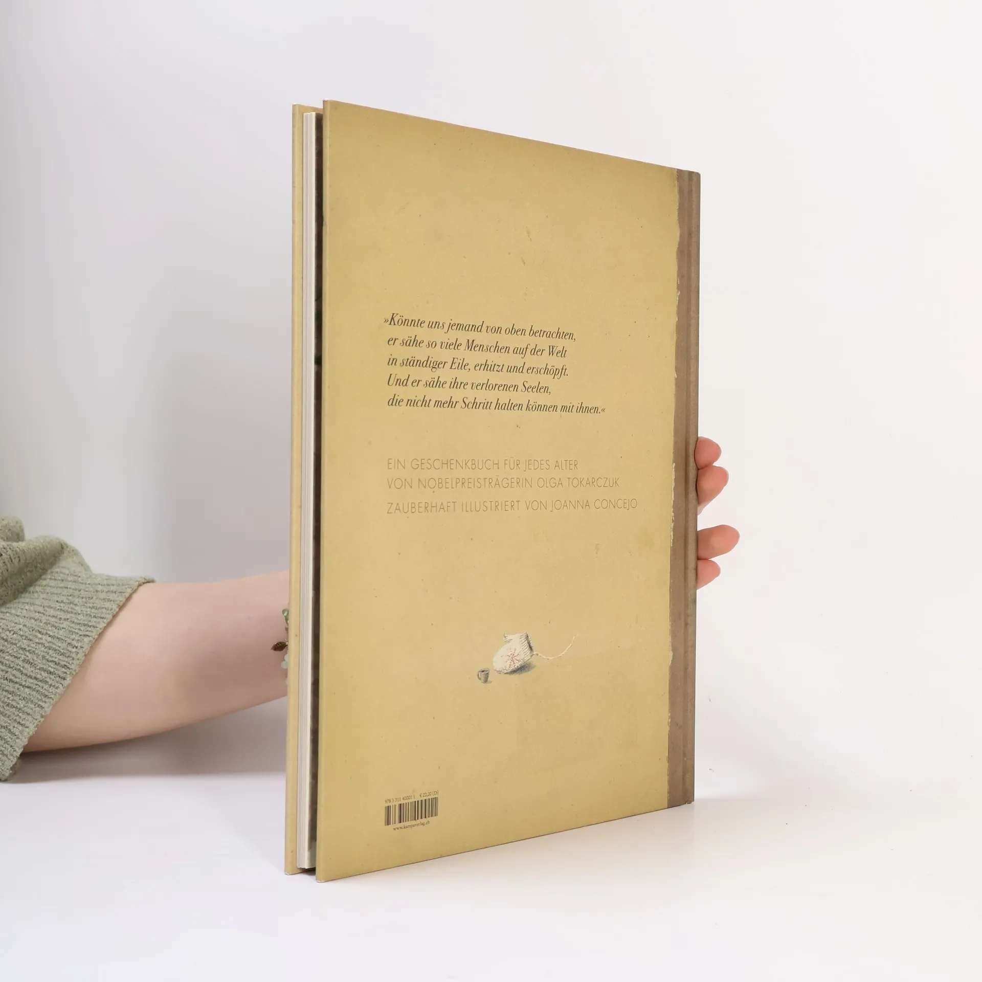 Ein Mann arbeitet viel und sehr schnell. Da hat seine Seele Mühe, ihm zu folgen, und geht verloren. Ihm bleibt nichts anderes übrig, als auf den Rat seiner Ärztin zu hören: Er muss warten – warten, bis seine Seele wieder bei ihm ist, ihn eingeholt hat. Und das kann eine Weile dauern. Olga Tokarczuk erzählt eine berührende Geschichte über die Kraft der Geduld und der Erinnerung – und über unseren Umgang mit uns selbst. Wie mit einer zweiten Stimme wird der Text von Joanna Concejos geheimnisvollen Bildern untermalt – ein eigenes Universum, das Träume und Phantasien weckt. Die verlorene Seele erhielt u. a. den Bologna Ragazzi Award, den Preis des Internationalen Kuratoriums für das Jugendbuch (IBBY) und steht auf der Empfehlungsliste der Internationalen Jugendbibliothek (The White Ravens).