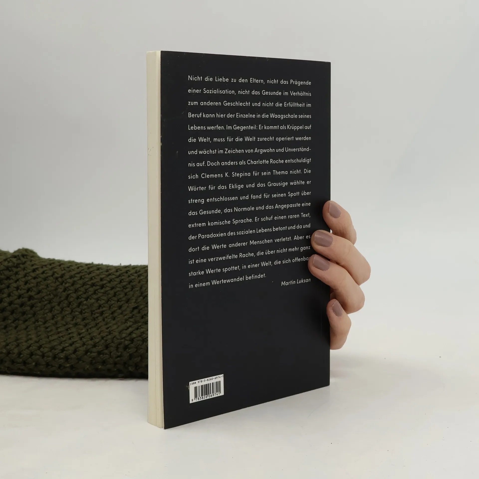 Nicht die Liebe zu den Eltern, nicht das Prägende einer Sozialisation, nicht das Gesunde im Verhältnis zum anderen Geschlecht und nicht die Erfülltheit im Beruf kann hier der Einzelne in die Waagschale seines Lebens werfen. Im Gegenteil: Er kommt als Krüppel auf die Welt, muss für die Welt zurecht operiert werden und wächst im Zeichen von Argwohn und Unverständnis auf. Doch anders als Charlotte Roche entschuldigt sich Clemens K. Stepina für sein Thema nicht. Die Wörter für das Eklige und das Grausige wählte er streng entschlossen und fand für seinen Spott über das Gesunde, das Normale und das Angepasste eine extrem komische Sprache. Er schuf einen raren Text, der Paradoxien des sozialen Lebens betont und da und dort die Werte anderer Menschen verletzt. Aber es ist eine verzweifelte Rache, die über nicht mehr ganz starke Werte spottet, in einer Welt, die sich offenbar in einem Wertewandel befindet. Martin Luksan
