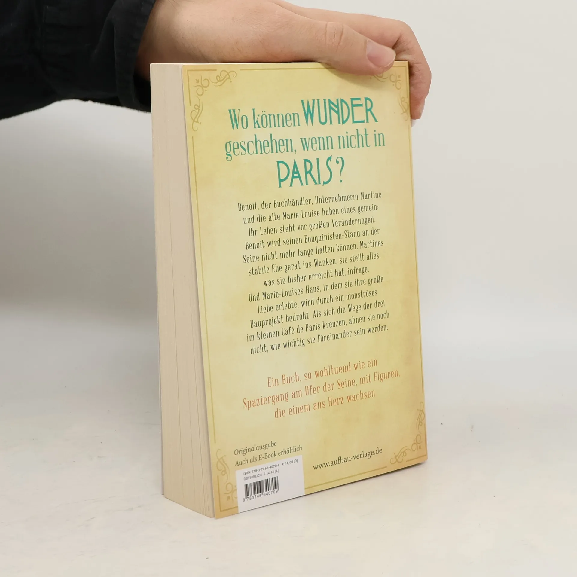 Wo können Wunder geschehen, wenn nicht in Paris? Benoît, der Buchhändler, Unternehmerin Martine und die alte Marie-Louise haben eines gemein: Ihr Leben steht vor großen Veränderungen. Benoît wird seinen Bouquinisten-Stand an der Seine nicht mehr lange halten können. Martines stabile Ehe gerät ins Wanken, sie stellt alles, was sie bisher erreicht hat, infrage. Und Marie-Louises Haus, in dem sie ihre große Liebe erlebte, wird durch ein monströses Bauprojekt bedroht. Als sich die Wege der drei im kleinen Café de Paris kreuzen, ahnen sie noch nicht, wie wichtig sie füreinander sein werden. Ein Buch, so wohltuend wie ein Spaziergang am Ufer der Seine, mit Figuren, die einem ans Herz wachsen
