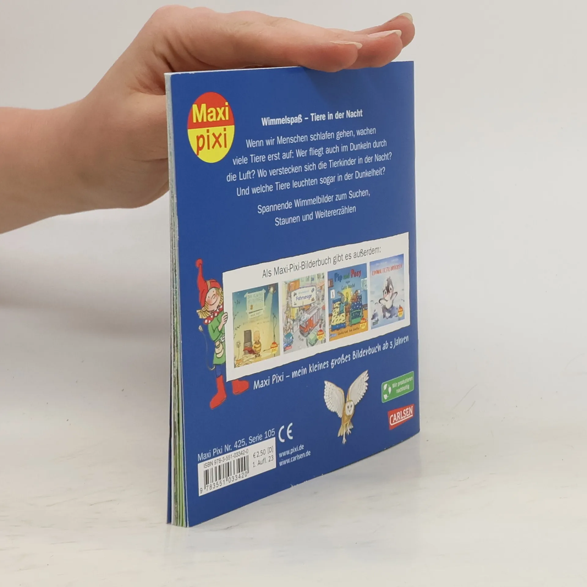 Wimmelspaß für unterwegs – zum Suchen, Staunen und Weitererzählen Wenn wir Menschen schlafen gehen, wachen viele Tiere erst auf: Wer fliegt auch im Dunkeln durch die Luft? Wo verstecken sich Tierkinder in der Nacht? Und welche Tiere leuchten sogar in der Dunkelheit? Spannende Wimmelbilder zum Suchen, Staunen und Weitererzählen für Kinder ab 3 Jahren. Maxi Pixi – die kleinen großen Bilderbücher im Softcover.