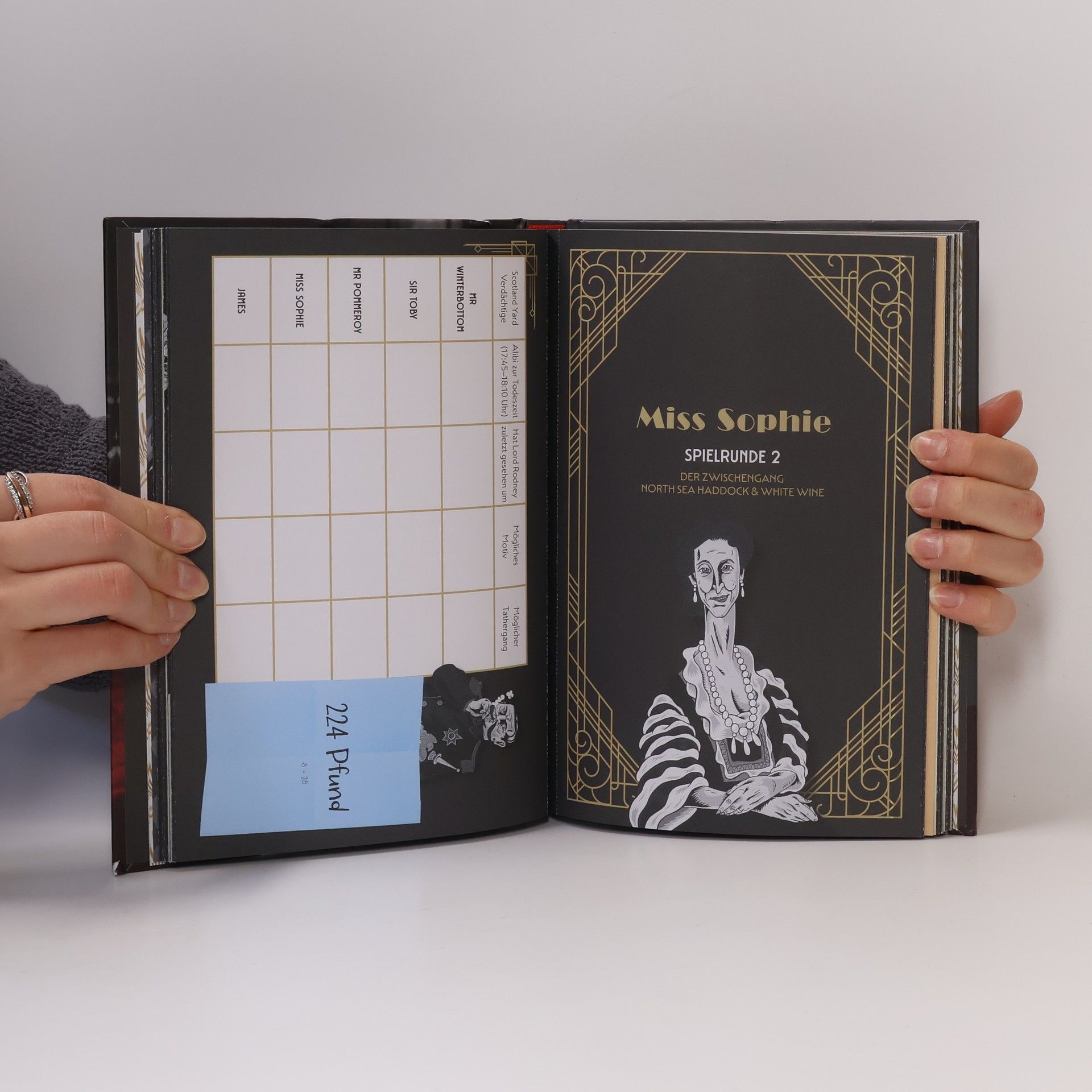 Ein raffiniertes Prequel zu Dinner for One wird als Krimi-Dinner-Rollenspiel präsentiert. Jedes Jahr verfolgen Millionen Zuschauer das berühmteste Dinner der Welt und stellen sich viele Fragen: Was geschah mit Miss Sophies Gästen? Wer tötete den Tiger? Welche Beziehung haben Butler James und Miss Sophie? In diesem Spiel können die Spieler*innen Antworten finden. Die Handlung spielt 40 Jahre vor Sophies 90. Geburtstag, in den 20er Jahren. Miss Sophies Ehemann, Lord Rodney, kehrt von einer Indienreise zurück und wird von seinen Freunden mit einer Willkommensparty überrascht. Doch das rauschende Fest endet tödlich, als der Lord tot auf dem Tigerfell aufgefunden wird. Scotland Yard tappt eine Woche nach dem mysteriösen Tod im Dunkeln. Chief Inspector Piperton kommt zur Hilfe, als sich die Partygäste zu Miss Sophies 50. Geburtstag erneut im Anwesen versammeln. Während eines glamourösen Dinners beginnt er mit den Befragungen, denn er vermutet, dass der Täter aus dem engsten Kreis des Verstorbenen stammen muss. Die Rollen umfassen Butler James, Miss Sophie, Mr. Pommeroy, Mr. Winterbottom, Admiral von Schneider, Sir Toby und Chief Inspector Piperton. Das Buch bietet herausnehmbare Einladungen, maßgeschneiderte Hefte für jede Rolle, Karten des Tatorts und Sitzplatzkarten sowie eine einfache Spielbeschreibung.