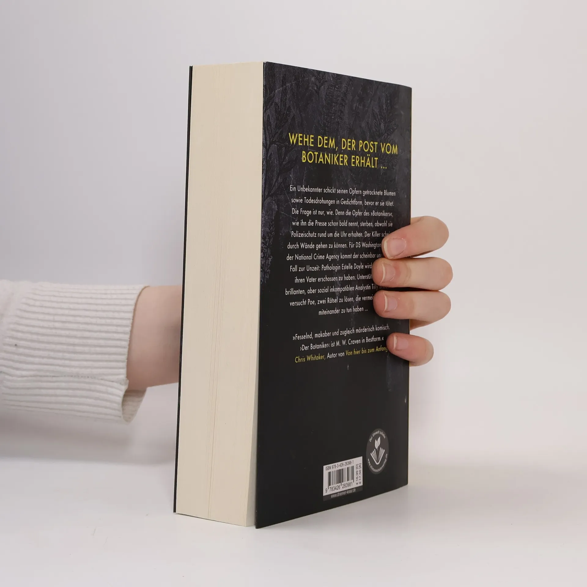 Die Top-Weihnachtsempfehlung: »Wer für dieses Jahr Spannung verschenken will - M. W. Craven „Der Botaniker“. Eine absolute Entdeckung!« Buchhandlung Belling, Lübeck Getrocknete Blumen, Gedichte – und Gift: Wehe dem, der Post vom Botaniker erhält … Der clevere Krimi des britischen Bestseller-Autors M. W. Craven begeistert mit einem Ermittler-Team voller Frauen-Power, gleich zwei scheinbar unlösbaren Rätseln und typisch englischem Humor. Clever und hochspannend - ein Mystery-Meisterwerk Er schickt seinen Opfern Gedichte und getrocknete Blumen, bevor er sie vergiftet – und er kann offenbar durch Wände gehen, denn selbst Polizeischutz rund um die Uhr kann ihn nicht stoppen.