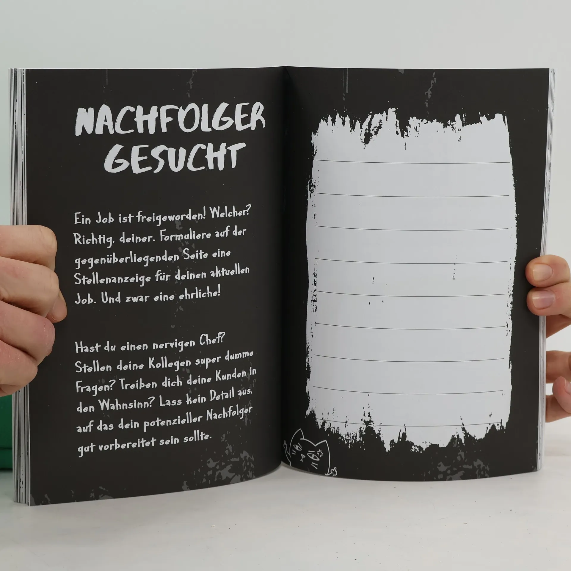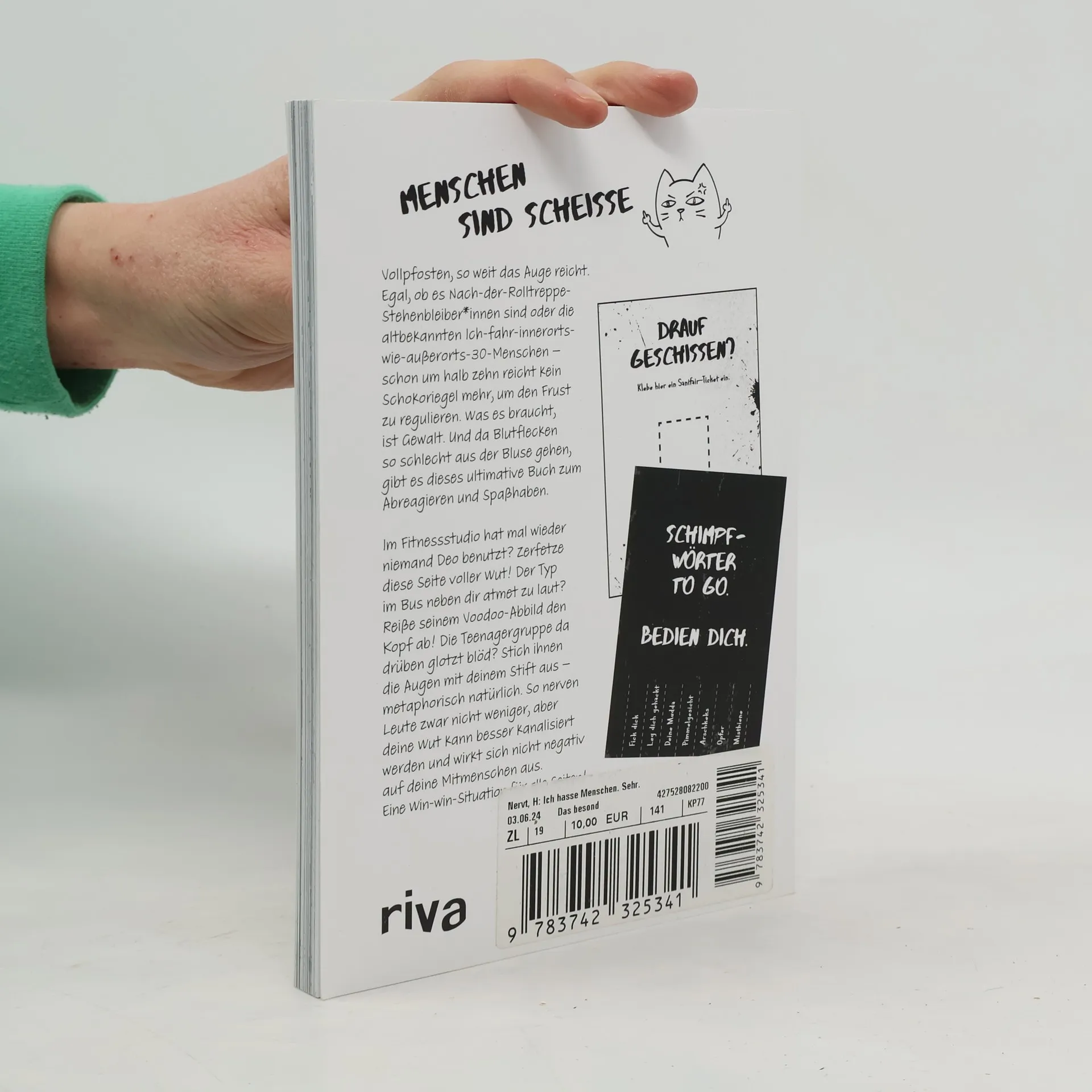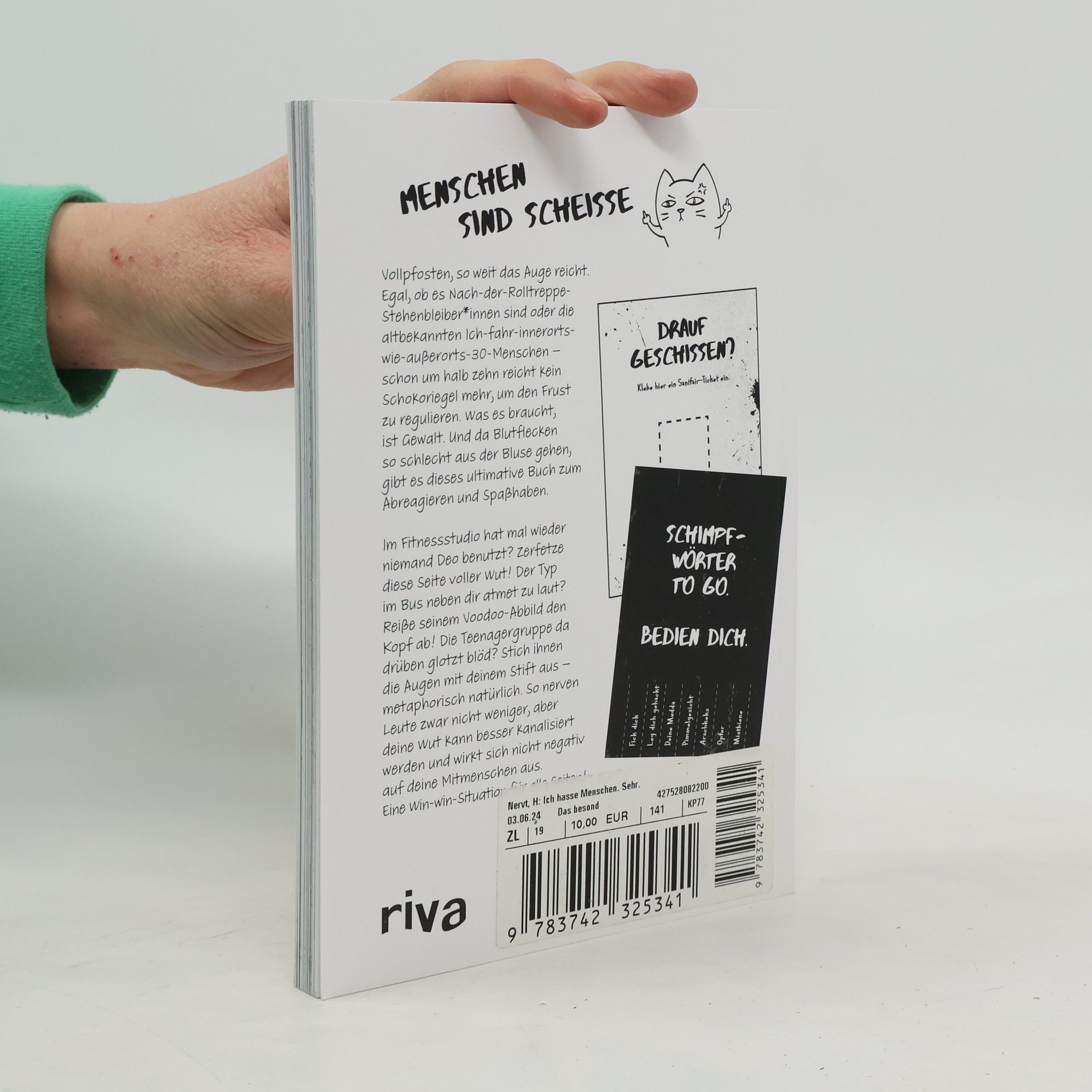 Vollpfosten, so weit das Auge reicht. Egal, ob es Nach-der-Rolltreppe-Stehenbleiber*innen sind oder die altbekannten Ich-fahr-innerorts-wie-außerorts-30-Menschen – schon um halb zehn reicht kein Schokoriegel mehr, um den Frust zu regulieren. Was es braucht, ist Gewalt. Und da Blutflecken so schlecht aus der Bluse gehen, gibt es dieses Buch zum Abreagieren. Die Chefin verlangt schon wieder Überstunden? Zerfetze diese Seite! Der Typ im Bus neben dir hat grad Döner mit extra Zwiebel gegessen? Schneide seinem Voodoo-Abbild die Arme ab! Die Teenagergruppe da drüben glotzt blöd? Stich ihnen die Augen mit deinem Stift aus – metaphorisch natürlich. So nerven Leute zwar nicht weniger, aber die Wut kann besser kanalisiert werden und wirkt sich nicht negativ auf die Mitmenschen aus. Eine Win-win-Situation für alle Seiten!