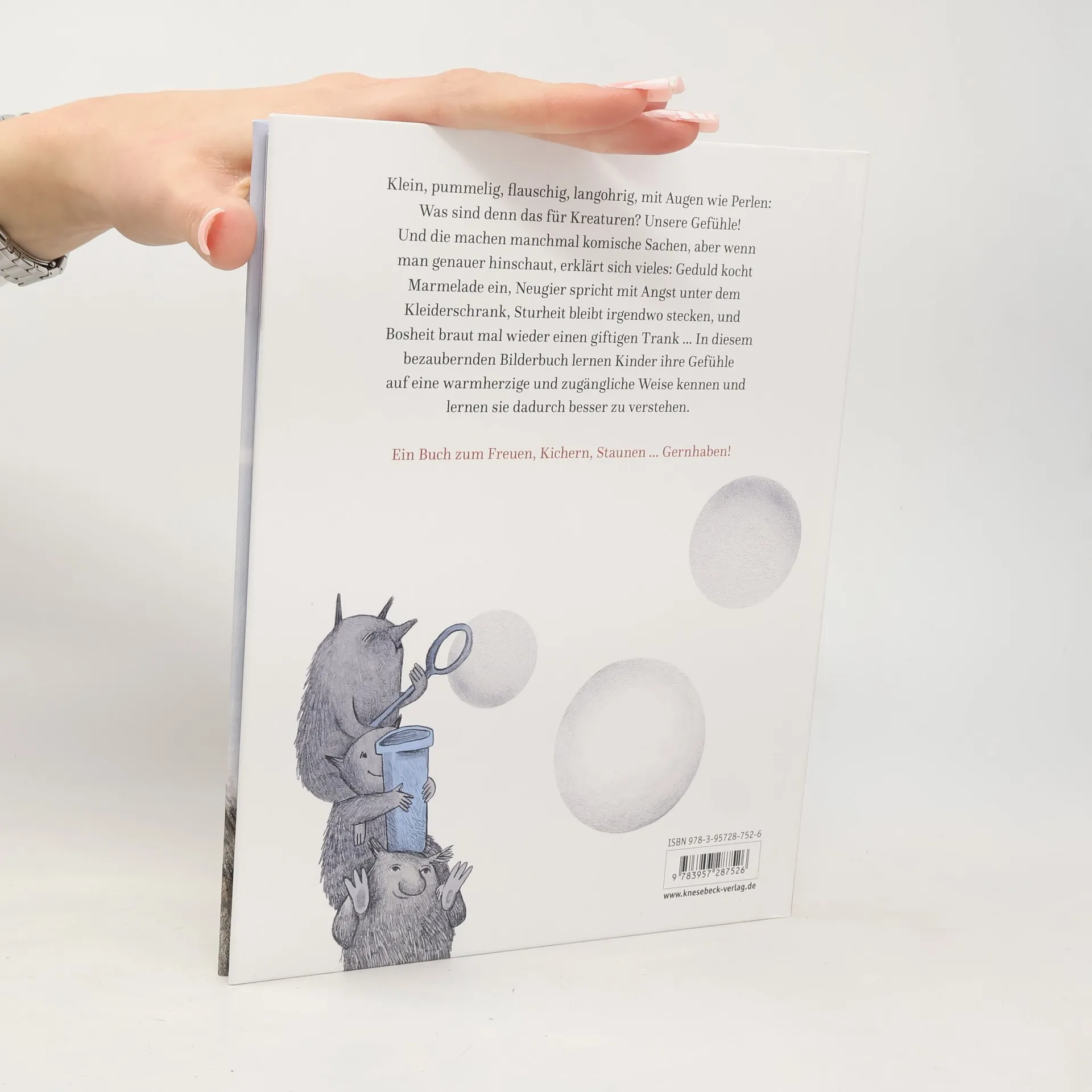 Gefühle und Emotionen, anschaulich und poetisch für Kinder dargestellt Klein, pummelig, flauschig, langohrig, mit Augen wie Perlen: Was sind denn das für Kreaturen? Unsere Gefühle machen manchmal komische Sachen, aber wenn man genauer hinschaut, erklärt sich einem vieles: Die Geduld kocht Marmelade ein, die Neugier spricht mit der Angst unter dem Kleiderschrank, die Sturheit bleibt irgendwo stecken, die Dankbarkeit geht mit einer Tasse heißem Kakao durch die Korridore der Erinnerung und Bosheit braut mal wieder einen giftigen Trank. In diesem bezaubernden Bilderbuch lernen Kinder ihre Gefühle auf eine ganz einzigartige und zugängliche Weise kennen und lernen sie dadurch besser zu verstehen. Ein witziges und warmherziges Buch über das, was in der Welt der Gefühle vor sich geht und Kindern unsere Empfindungen bildlich verdeutlicht. Ein wahrer Vorlesespaß für Kinder und Erwachsene!