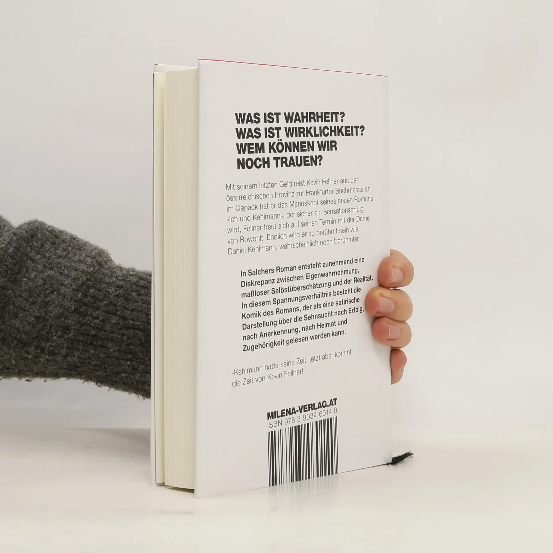 Was ist Wahrheit? Was ist Wirklichkeit? Wem können wir noch trauen? Kevin Fellner reist mit seinem letzten Geld von der österreichischen Provinz nach Frankfurt am Main zur Buchmesse, um sein Manuskript zu präsentieren. Er ist überzeugt, dass sein neuer Roman ein Sensationserfolg wird und freut sich auf den Termin mit der Dame von Rowohlt. Voller Tatendrang und Selbstbewusstsein erreicht er sein Hotel, wo er endlich den Vertrag für „Ich und Kehlmann“ unterschreiben möchte. Kehlmann hatte seine Zeit, jetzt ist die Zeit von Kevin Fellner gekommen. Zufällig wohnt Kehlmann im selben Hotel, was Fellner als magisches Zeichen deutet. Der Titel seines Romans spielt auf Kehlmanns Satire „Ich und Kaminski“ an. Fellner, ein eitler Ich-Erzähler, versucht, sein fast fertiges Manuskript bei einem renommierten Verlag unterzubringen. Auf der Buchmesse will er endlich sein Idol kennenlernen, was eine inspirierende Freundschaft verspricht. Doch die Diskrepanz zwischen seiner Selbstwahrnehmung und der Realität wird zunehmend offensichtlich. In Christoph Salchers humorvollem und gesellschaftskritischem Roman entsteht eine Komik, die die Sehnsucht nach Erfolg, Anerkennung, Heimat und Zugehörigkeit thematisiert. Wird Fellner die Buchbranche überzeugen können?