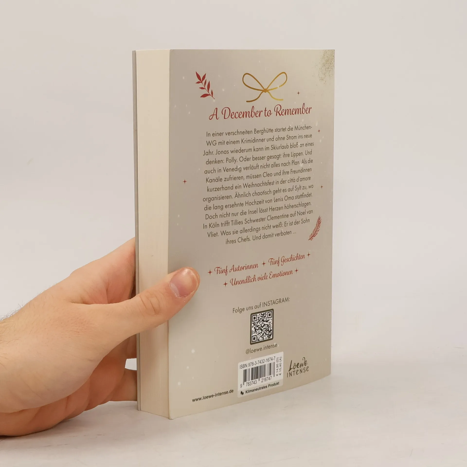 Heiligabend in Venedig oder Silvester in den Bergen? Während die München-WG mit einem Krimidinner und ohne Strom ins neue Jahr startet, denkt Jonas im Skiurlaub nur an Polly und ihre Lippen. In Venedig müssen Cleo, Sofia und Livia ein Weihnachtsfest organisieren, als die Kanäle zufrieren. Auf Sylt findet die lang ersehnte Hochzeit von Lenis Oma statt, wo auch Noel van Viet, der Sohn von Clementines Chef, für Aufregung sorgt – eine verbotene Anziehung. Fünf Autorinnen – Gabriella Santos de Lima, Marina Neumeier, Alexandra Flint, Carolin Wahl und Kyra Groh – erzählen in diesem Sammelband von starken Protagonistinnen, herzerwärmenden Freundschaften und weihnachtlichen Abenteuern. In fünf winterlichen Kurzgeschichten erleben New-Adult-Leser*innen die Feiertage mit ihren liebsten Intense-Protagonist*innen vor romantischer Kulisse, einschließlich Weihnachtsmarkt, Schneegestöber und Rutschpartien ins neue Jahr. Ein klimaneutrales Produkt – wir unterstützen ausgewählte Klimaprojekte!