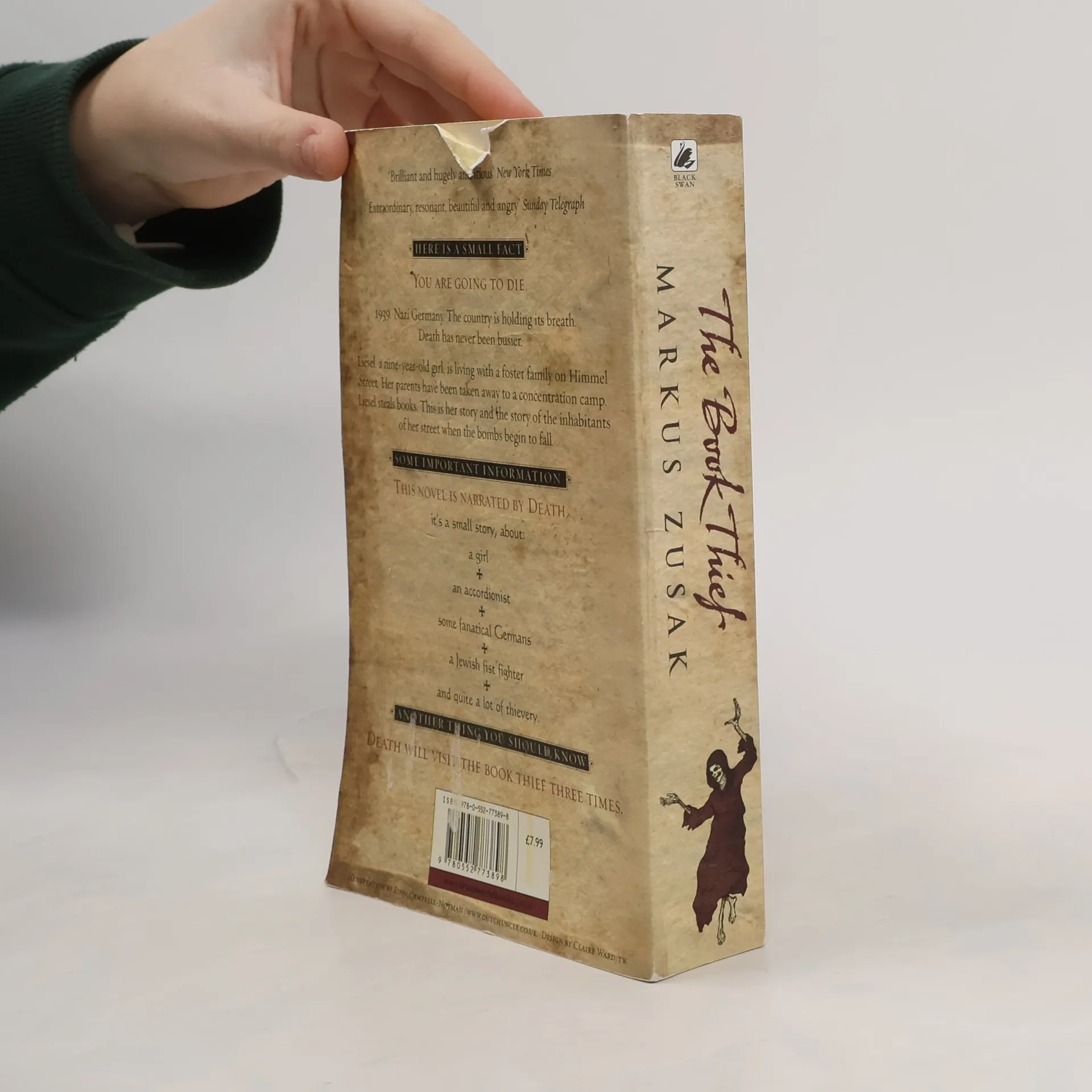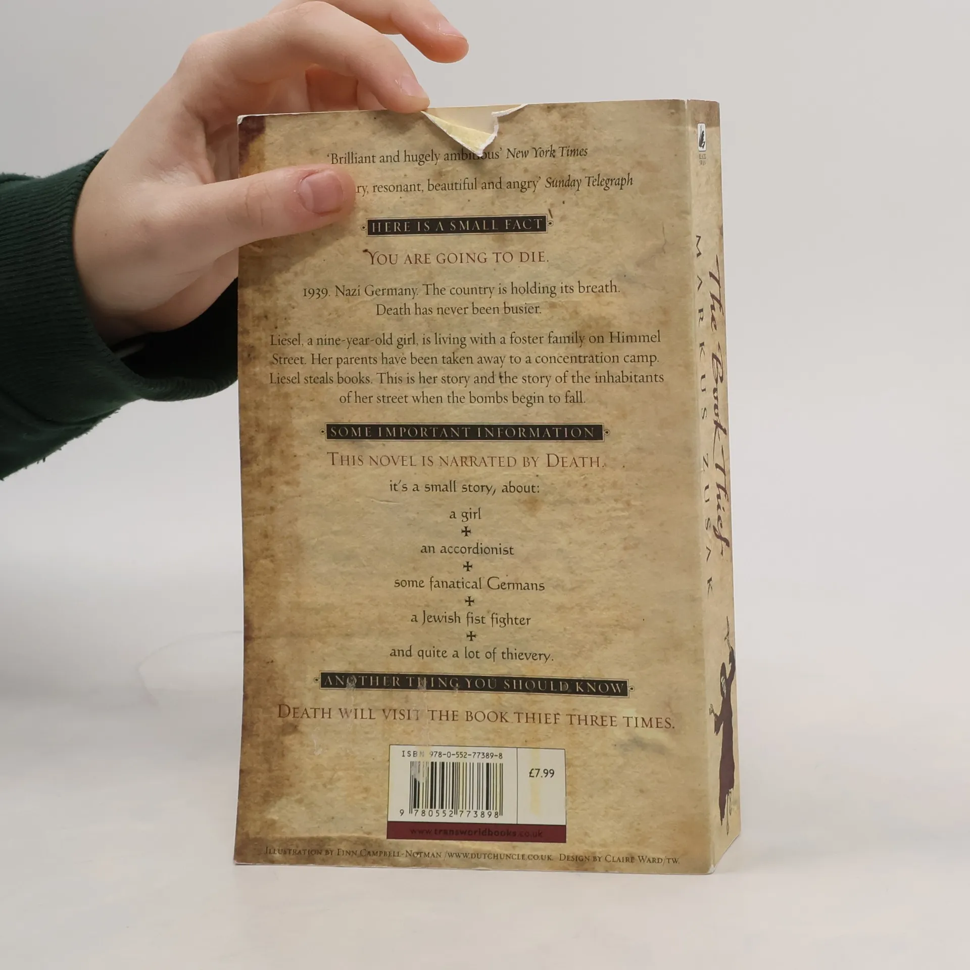 HERE IS A SMALL FACT - YOU ARE GOING TO DIE 1939. Nazi Germany. The country is holding its breath. Death has never been busier. Liesel, a nine-year-old girl, is living with a foster family on Himmel Street. Her parents have been taken away to a concentration camp. Liesel steals books. This is her story and the story of the inhabitants of her street when the bombs begin to fall. SOME IMPORTANT INFORMATION - THIS NOVEL IS NARRATED BY DEATH It's a small story, about: a girl an accordionist some fanatical Germans a Jewish fist fighter and quite a lot of thievery. ANOTHER THING YOU SHOULD KNOW - DEATH WILL VISIT THE BOOK THIEF THREE TIMES