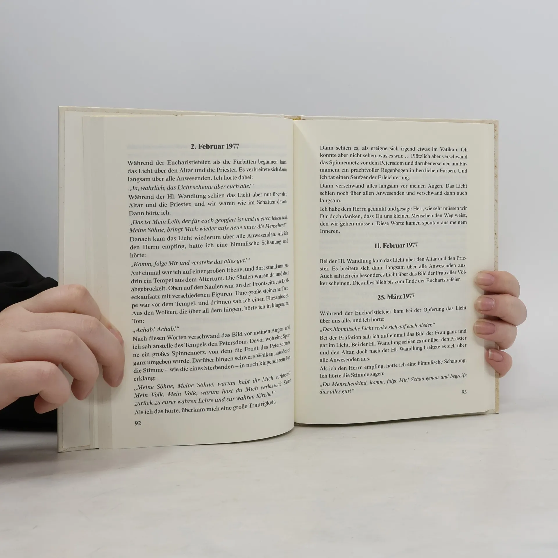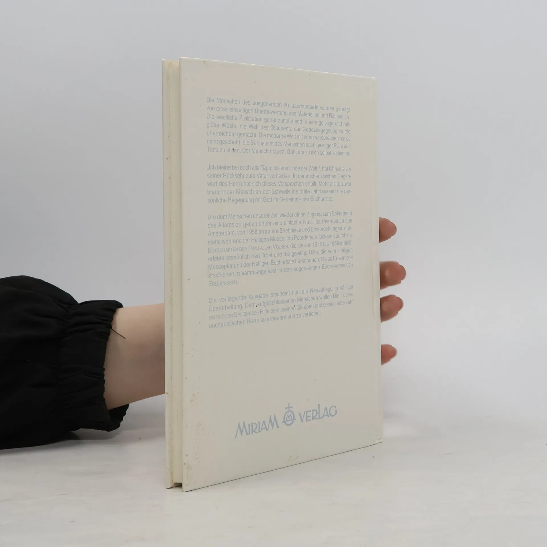 Im Anschluß an die Botschaften der Frau aller Völker hatte die Seherin Ida Peerdeman von 1958 bis 1984 mystische Erlebnisse, deren Mittelpunkt der eucharistische Herr ist. Die Visionen führten sie durch längst vergangene Epochen, zeigten ihr den Zustand der heutigen Kirche und wie sie bedroht wird, aber auch den Triumph der Kirche, der mit Maria und dem Heiligen Geist am Ende der großen Drangsal steht. Wir leben jetzt in der Zeit der Erwartung des letzten marianischen Dogmas, auf das die Visionen hinführen.