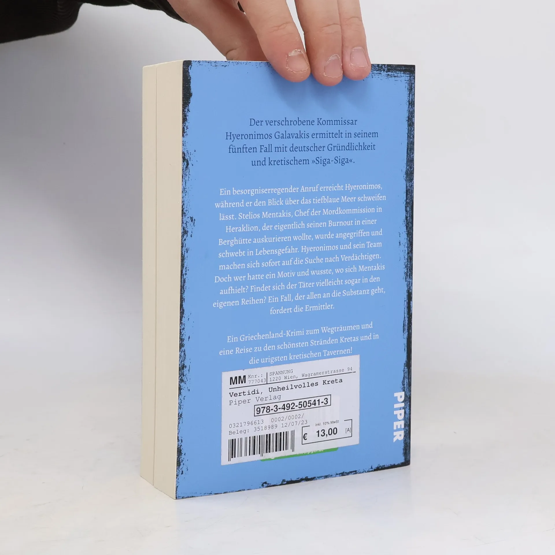 Der verschrobene Kommissar Hyeronimos Galavakis ermittelt in seinem fünften Fall mit deutscher Gründlichkeit und kretischem »Siga-Siga«. Ein Griechenland-Krimi zum Wegträumen und eine Reise zu den schönsten Stränden und in die urigsten Tavernen Kretas Ein besorgniserregender Anruf erreicht Hyeronimos, während er den Blick über das tiefblaue Meer schweifen lässt. Stelios Mentakis, Chef der Mordkommission in Heraklion, der eigentlich seinen Burnout in einer Berghütte auskurieren wollte, wurde angegriffen und schwebt in Lebensgefahr. Hyeronimos und sein Team machen sich sofort auf die Suche nach Verdächtigen. Doch wer hatte ein Motiv und wusste, wo sich Mentakis aufhielt? Findet sich der Täter vielleicht sogar in den eigenen Reihen? Ein Fall, der allen an die Substanz geht, fordert die Ermittler.