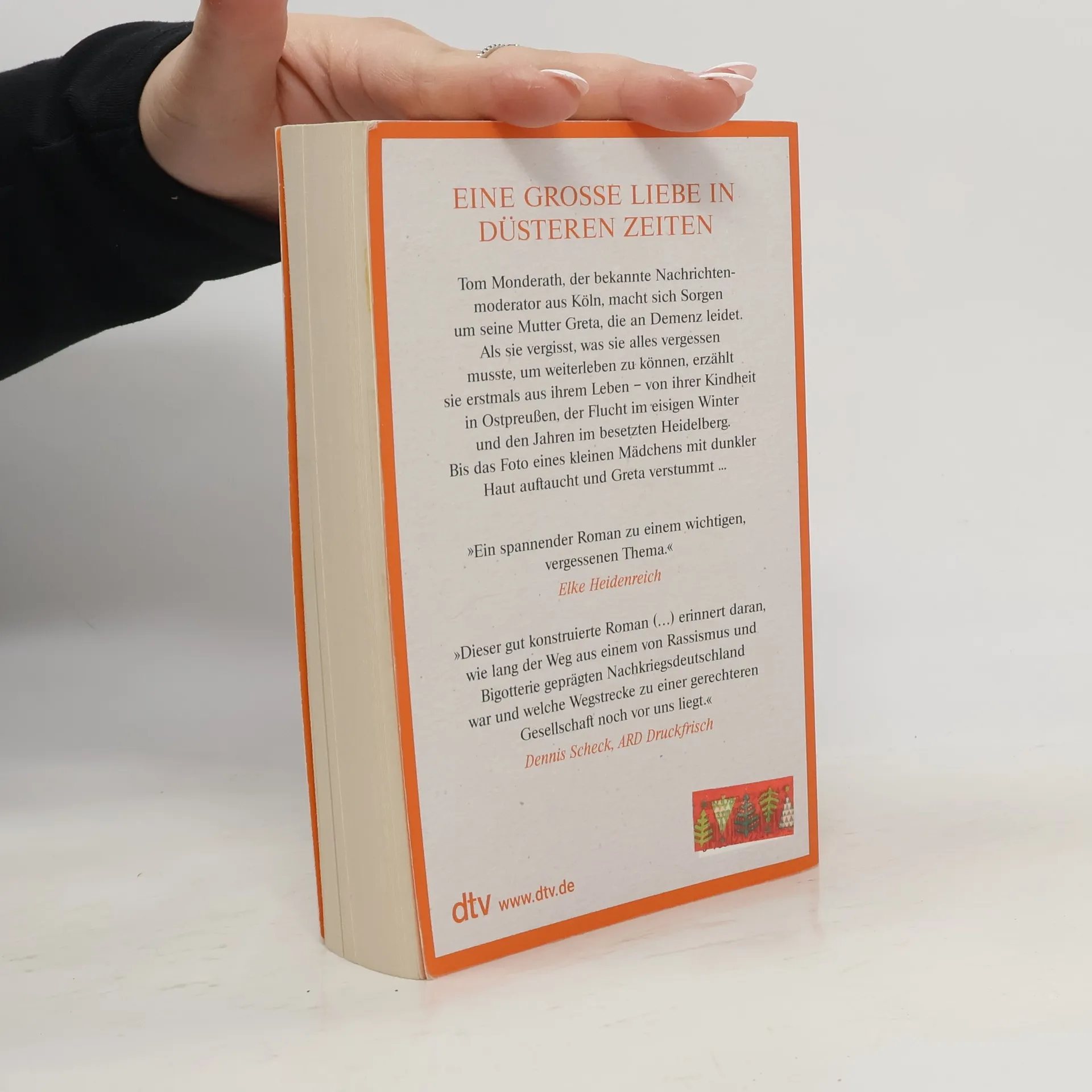 Eine große Liebe in düsteren Zeiten ist ein bemerkenswertes Debüt und ein generationsübergreifender Familienroman. Der Kölner Nachrichtenmoderator Tom Monderath ist besorgt um seine 84-jährige Mutter Greta, die zunehmend vergesslich wird. Als die Diagnose Demenz im Raum steht, ist Tom erschüttert. Doch die Krankheit wird zu einem Geschenk, als Greta beginnt, von ihrem Leben zu erzählen – von ihrer Kindheit in Ostpreußen, ihren geliebten Großeltern, der Flucht vor den russischen Soldaten im Winter und ihrer Zeit im besetzten Heidelberg. Als Tom jedoch ein Foto eines kleinen Mädchens mit dunkler Haut entdeckt, verstummt Greta. Dies führt Tom dazu, sich intensiver mit der Vergangenheit seiner Mutter auseinanderzusetzen, um ihre Traurigkeit zu verstehen und sein eigenes Glück zu finden. Nichts bleibt für immer vergessen – die Autorin schreibt hochemotional, klug und einfühlsam. Der Roman thematisiert wichtige, oft vergessene Aspekte der Geschichte und reflektiert über den langen Weg aus einem von Rassismus und Bigotterie geprägten Nachkriegsdeutschland.