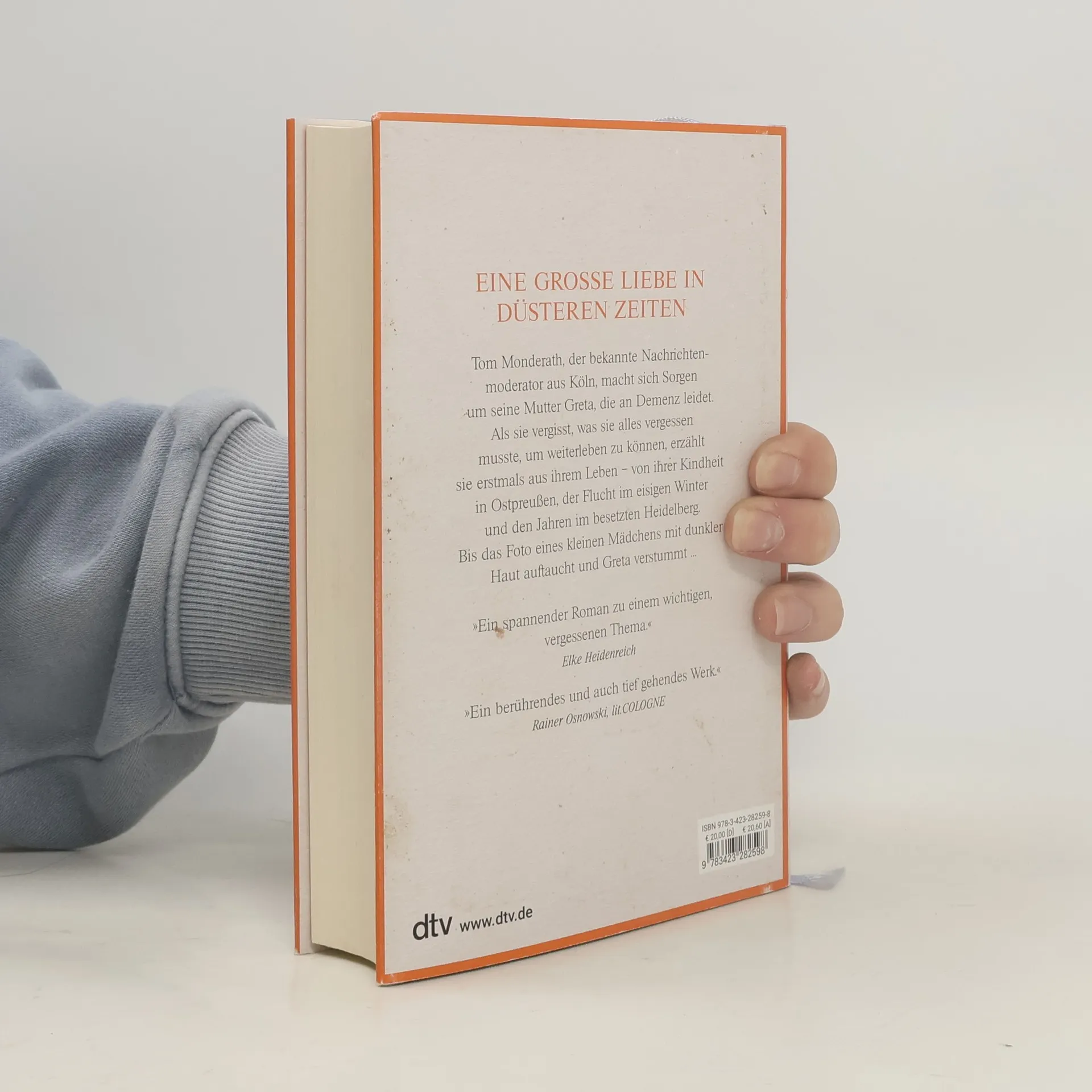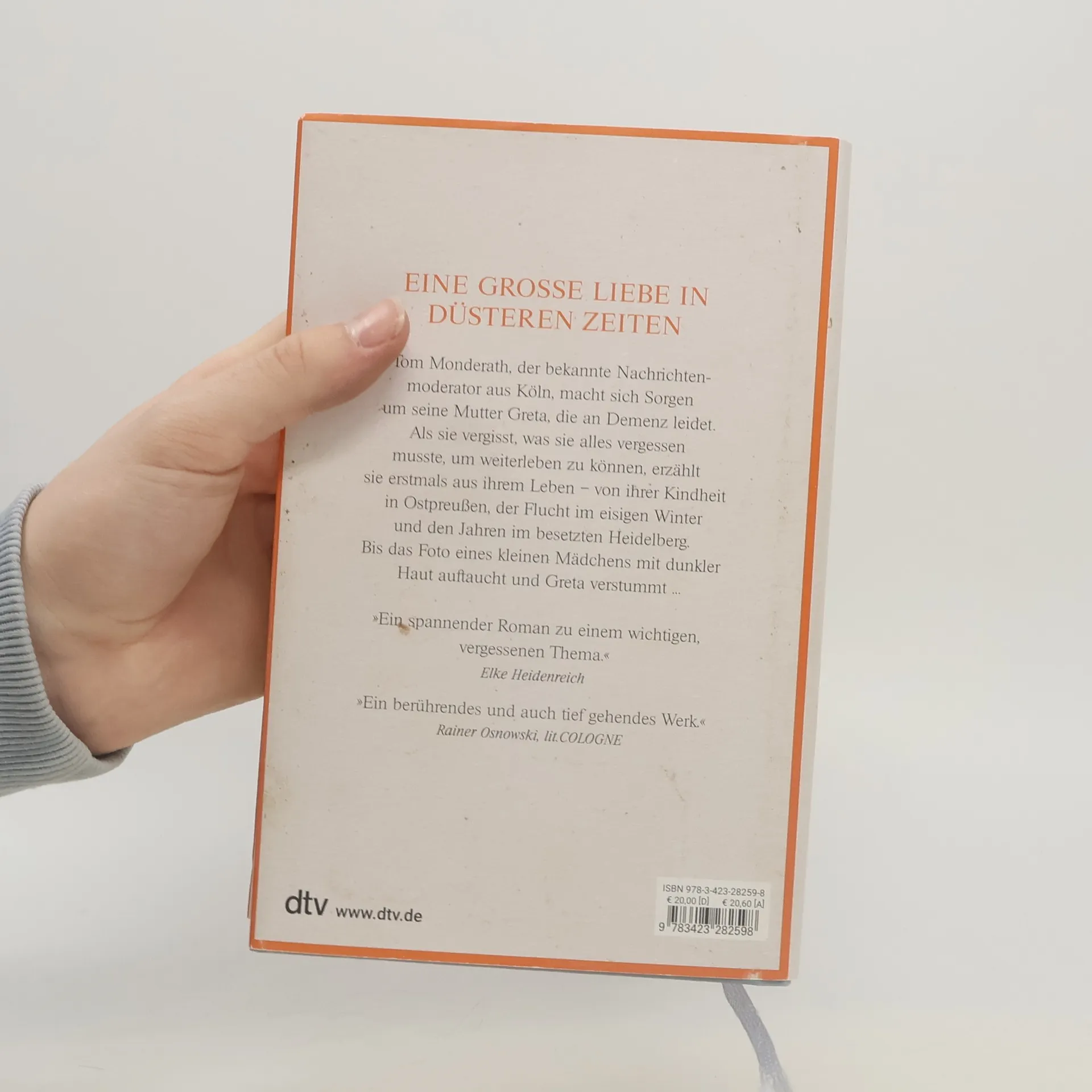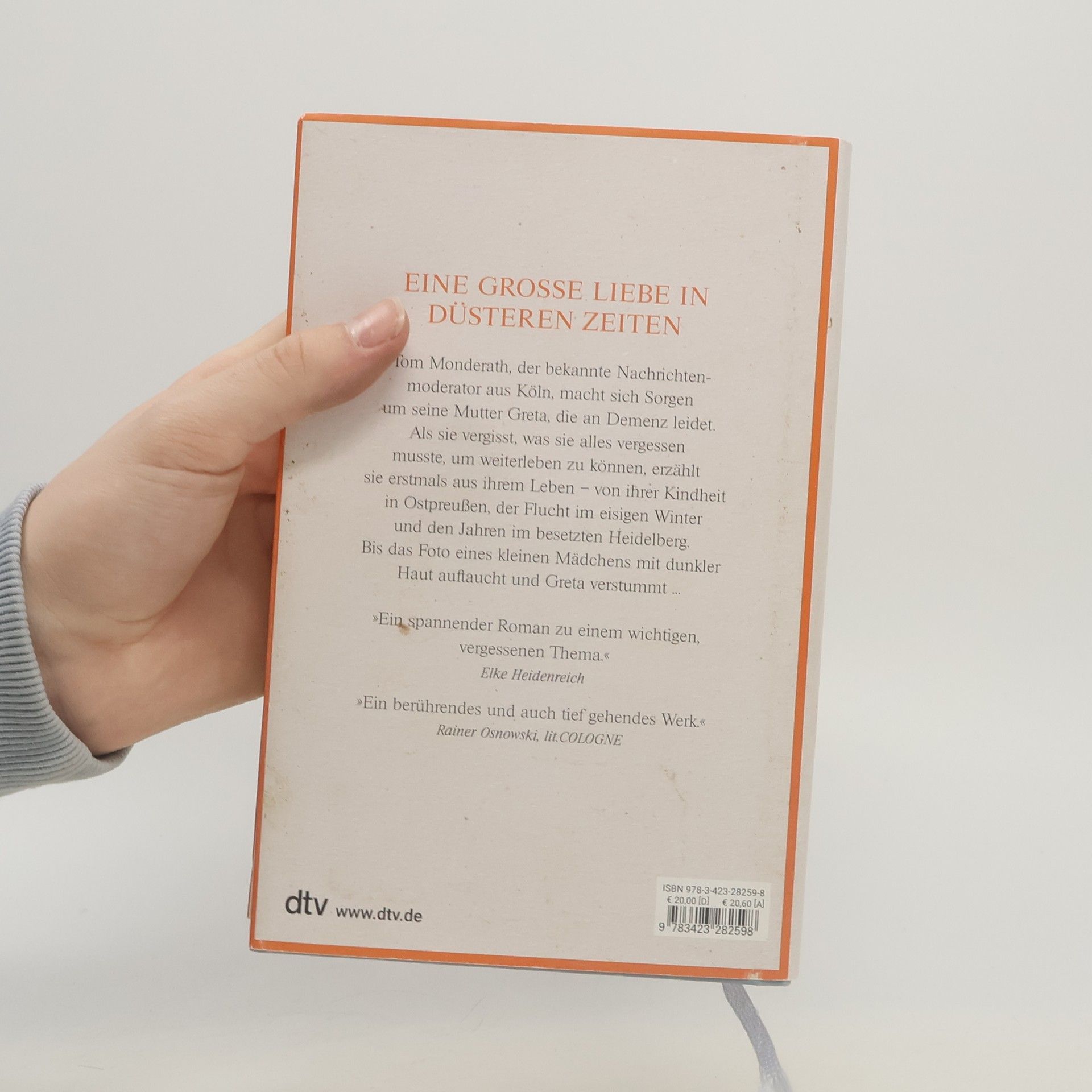 Eine große Liebe in dunklen Zeiten Der bekannte Kölner Nachrichtenmoderator Tom Monderath macht sich Sorgen um seine 84-jährige Mutter Greta, die immer mehr vergisst. Was anfangs ärgerlich für sein scheinbar so perfektes Leben ist, wird unerwartet zu einem Geschenk. Nach und nach erzählt Greta aus ihrem Leben – von ihrer Kindheit in Ostpreußen, der Flucht vor den russischen Soldaten im eisigen Winter, der Sehnsucht nach dem verschollenen Vater und ihren Erfolgen auf dem Schwarzmarkt in Heidelberg. Als Tom jedoch auf das Foto eines kleinen Mädchens mit dunkler Haut stößt, verstummt Greta. Zum ersten Mal beginnt Tom, sich eingehender mit der Vergangenheit seiner Mutter zu befassen. Nicht nur, um endlich ihre Traurigkeit zu verstehen. Es geht auch um sein eigenes Glück.