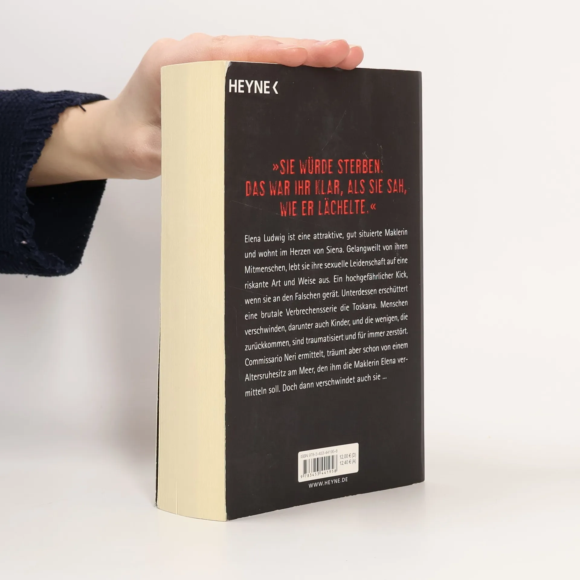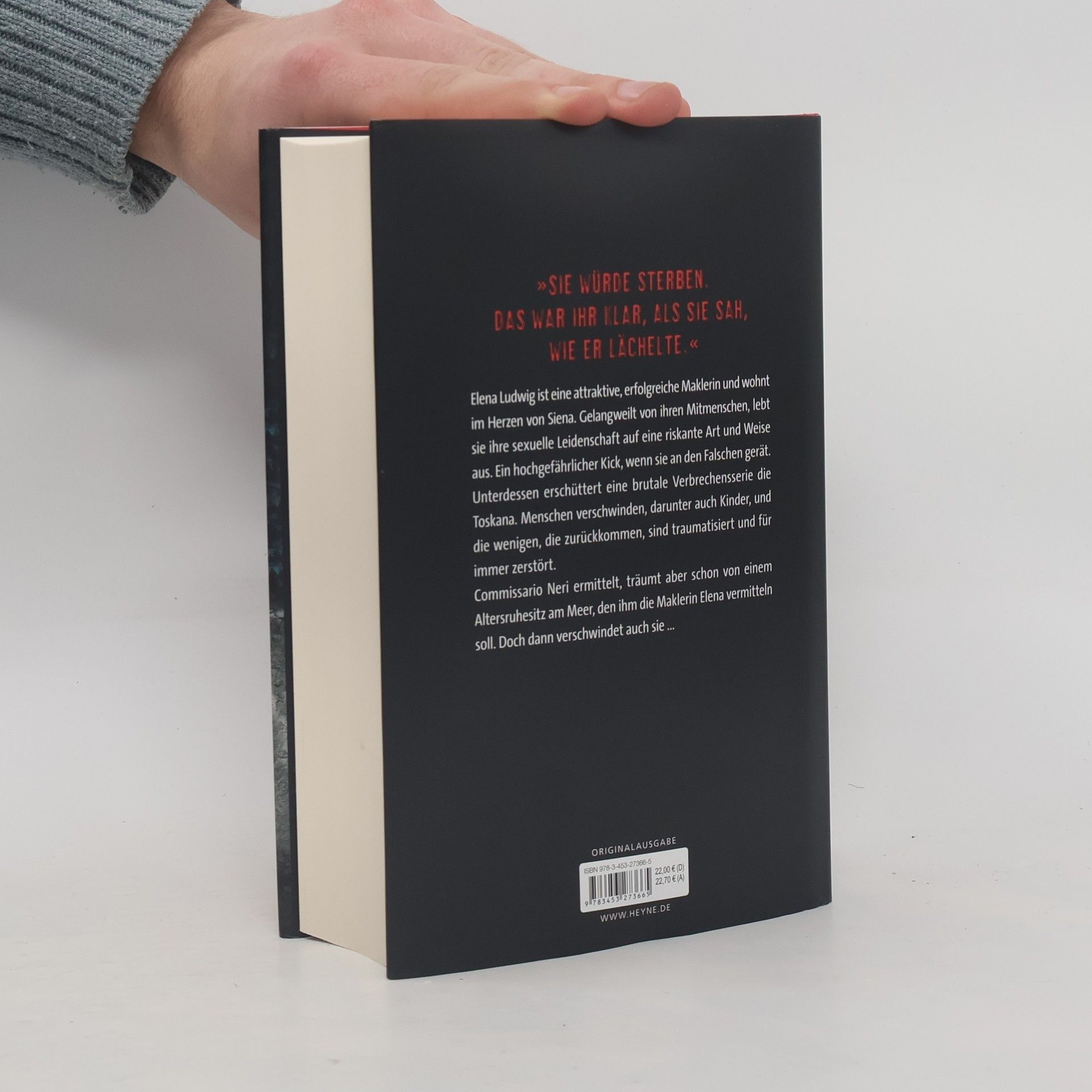 Elena Ludwig ist eine attraktive, gut situierte Maklerin und wohnt im Herzen von Siena. Gelangweilt von ihren Mitmenschen, lebt sie ihre sexuelle Leidenschaft auf eine riskante Art und Weise aus. Ein hochgefährlicher Kick, wenn sie an den Falschen gerät. Unterdessen erschüttert eine brutale Verbrechensserie die Toskana. Menschen verschwinden, und die wenigen, die zurückkommen, sind traumatisiert und für immer zerstört. Commissario Neri ermittelt, träumt aber schon von einem Altersruhesitz am Meer, den ihm die Maklerin Elena vermitteln soll. Doch dann verschwindet auch sie...