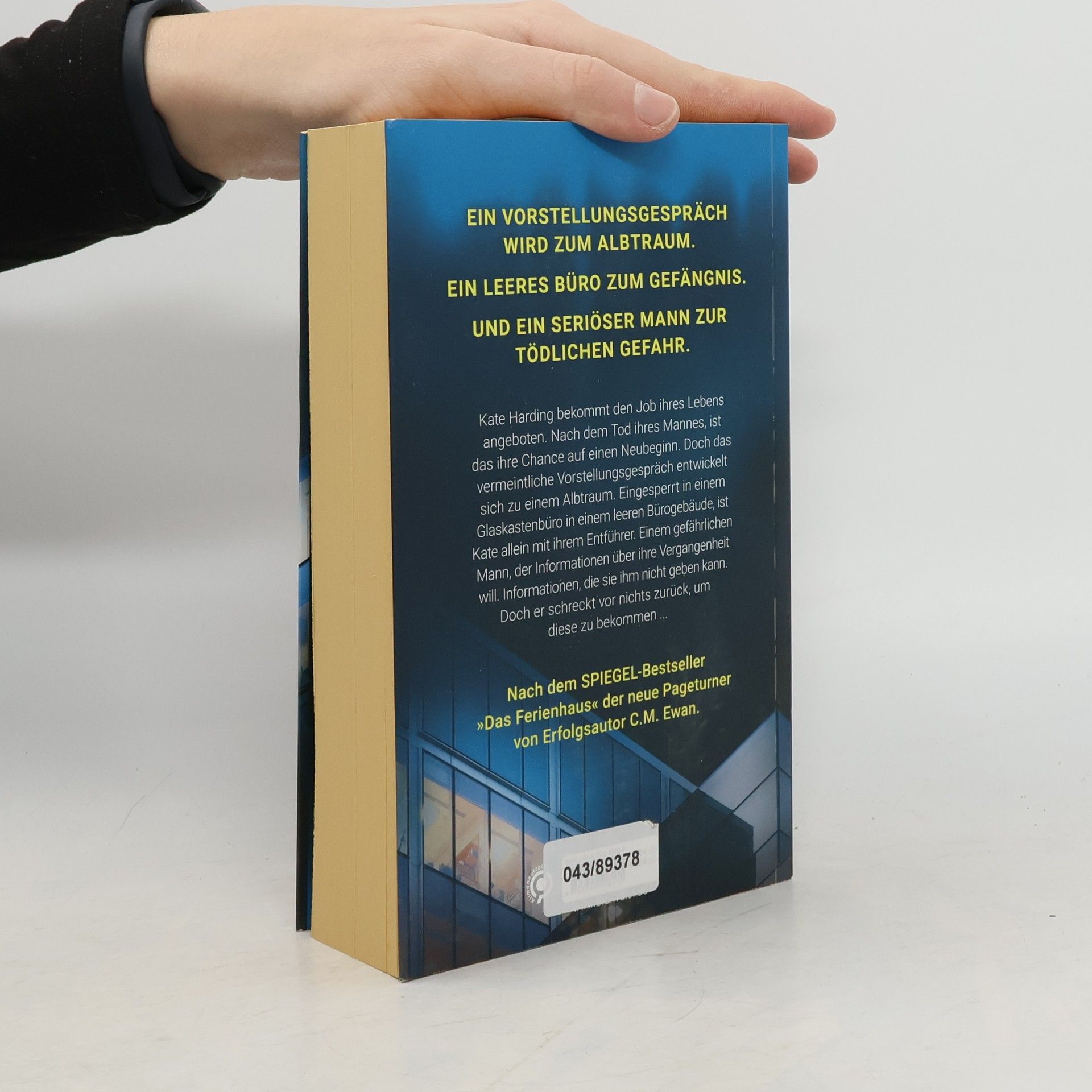 Ein Vorstellungsgespräch wird zum Albtraum. Ein leeres Büro zum Gefängnis. Und ein seriöser Mann zur tödlichen Gefahr. Nach dem SPIEGEL-Bestseller »Das Ferienhaus« der neue Pageturner von C. M. Ewan. Kate Harding bekommt den Job ihres Lebens angeboten. Nach dem Tod ihres Mannes vor fünfzehn Monaten, ist das ihre Chance auf einen Neubeginn. Doch das vermeintliche Vorstellungsgespräch entwickelt sich zu einem Albtraum. Eingesperrt in einem Glaskastenbüro in einem leeren Bürogebäude, ist Kate allein mit ihrem Entführer. Einem gefährlichen Mann, der Informationen über ihre Vergangenheit will. Informationen, die sie ihm nicht geben kann. Doch er schreckt vor nichts zurück, um diese zu bekommen ... Lesen Sie auch den SPIEGEL-Bestseller »Das Ferienhaus«.