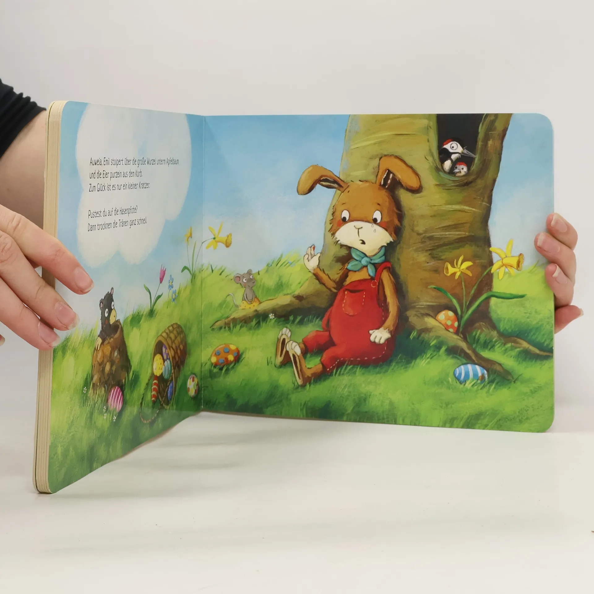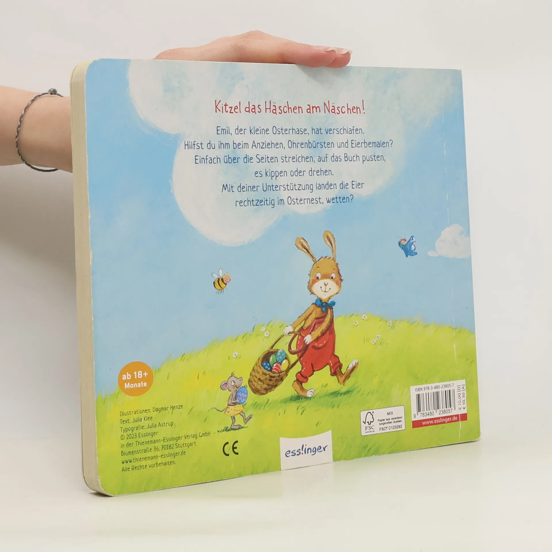 Kitzel das Häschen am Näschen! Liebevolles Oster-Mitmach-Buch für Kinder ab 18 Monaten. Emil, der kleine Osterhase, hat verschlafen! Die Allerkleinsten dürfen ihm beim Anziehen, Ohrenbürsten und Eierbemalen helfen. Einfach über die Seiten streichen, auf das Buch pusten, es kippen oder drehen. Es ist ganz einfach und macht Riesenspaß! Und der kleine Osterhase freut sich: Denn die Eier landen rechtzeitig im Osternest. Auf jeder Seite gibt es viele tolle Details, die zum Entdecken einladen und Sprache fördern. Dieses zuckersüße Pappbilderbuch zum Immer-wieder-Anschauen und Mitmachen ist das perfekte Geschenk fürs Osternest für Jungen und Mädchen!