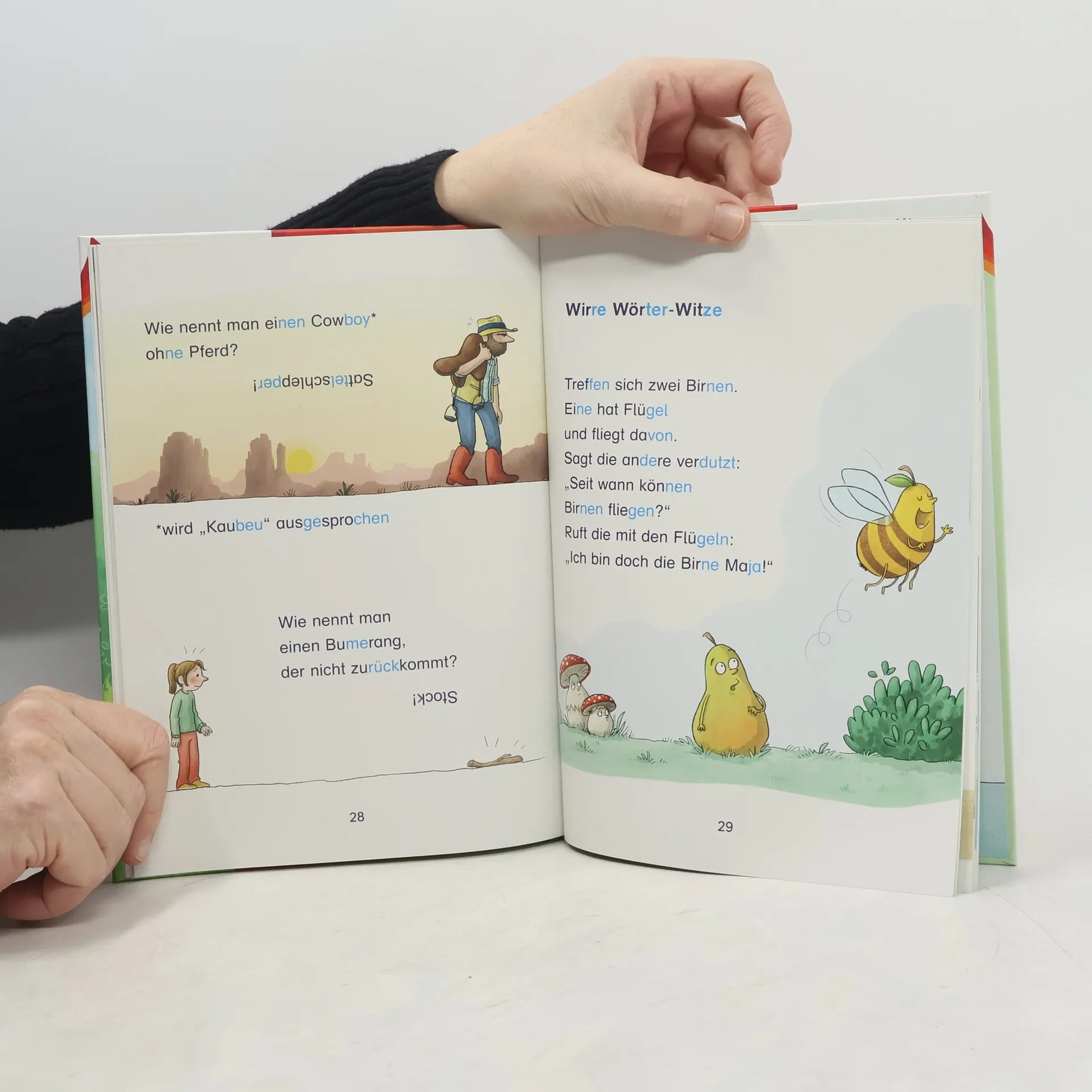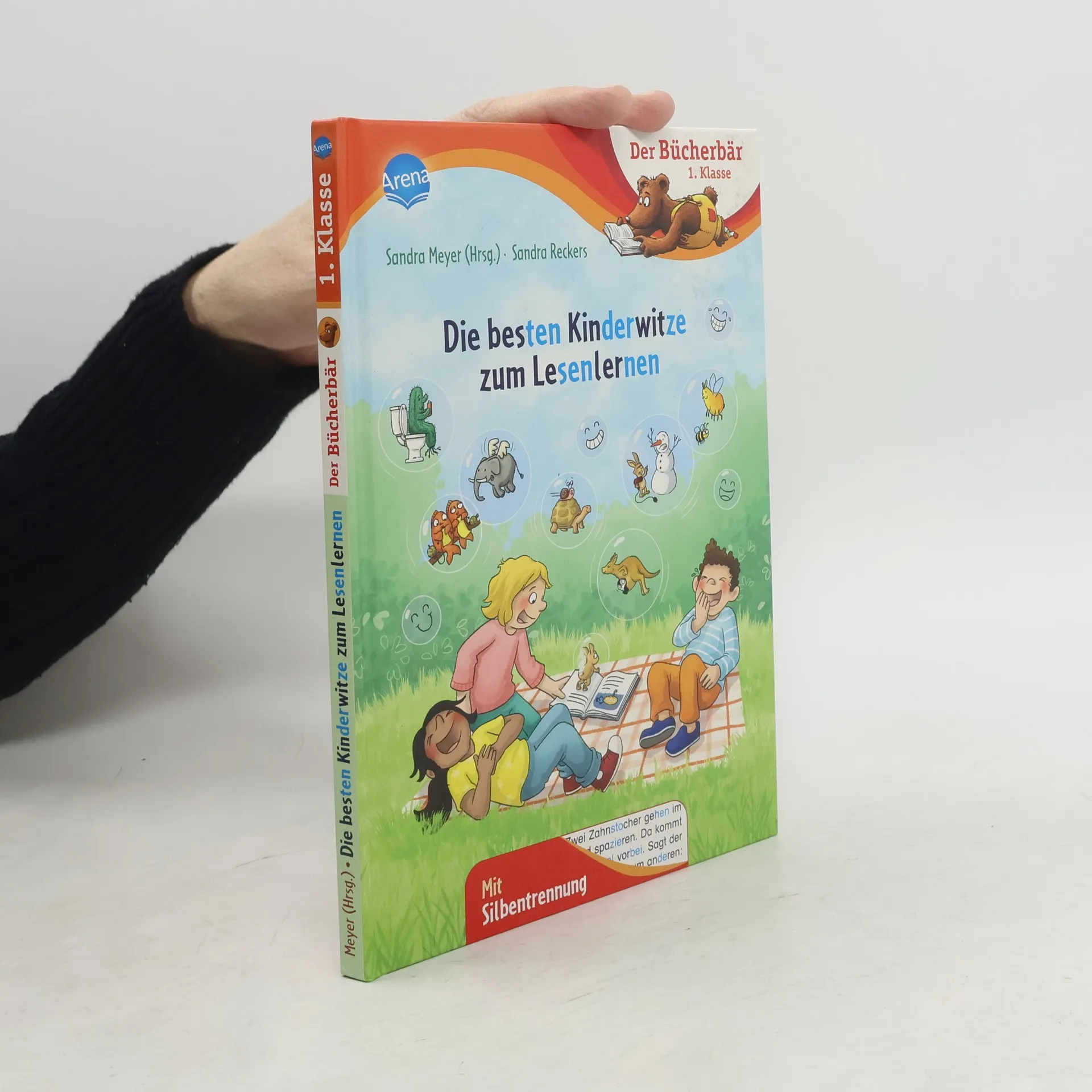 Lesen lernen mit dem Bücherbär und kunterbunten Kinderwitzen zum Schieflachen - das macht stark für die 1. Klasse Mit Witzen und Scherzfragen zum Schieflachen macht Lesenlernen einfach Spaß! Egal, ob Wirre-Wörter-Witze, Wer-wie-wo-was-Witze, Tier-, Schul- oder Alltagswitze - an den kurzen Texten haben Leseanfänger*innen ihre Freude. Auf die Witze, fertig, los! Dieses Buch richtet sich an Leseanfänger in der 1. Klasse . Die besonders übersichtlichen Leseeinheiten und kurzen Zeilen sind ideal zum Lesenlernen. Das Hervorheben der Sprechsilben in Dunkelblau/Hellblau hilft dabei, ein Wort richtig lesen und verstehen zu können. So können Leseanfänger jede Sprechsilbe erkennen. Witze und Scherzfragen regen zum Nachdenken und Weitererzählen an und fördern damit die Lesekompetenz. Denn Kinder, die viel Gelegenheit zum Sprechen haben, lernen auch schneller lesen. • Empfohlen von Westermann • Gedruckt auf Umweltpapier und zertifiziert mit dem „Blauen Engel“ . • Der Titel ist auf Antolin. de gelistet