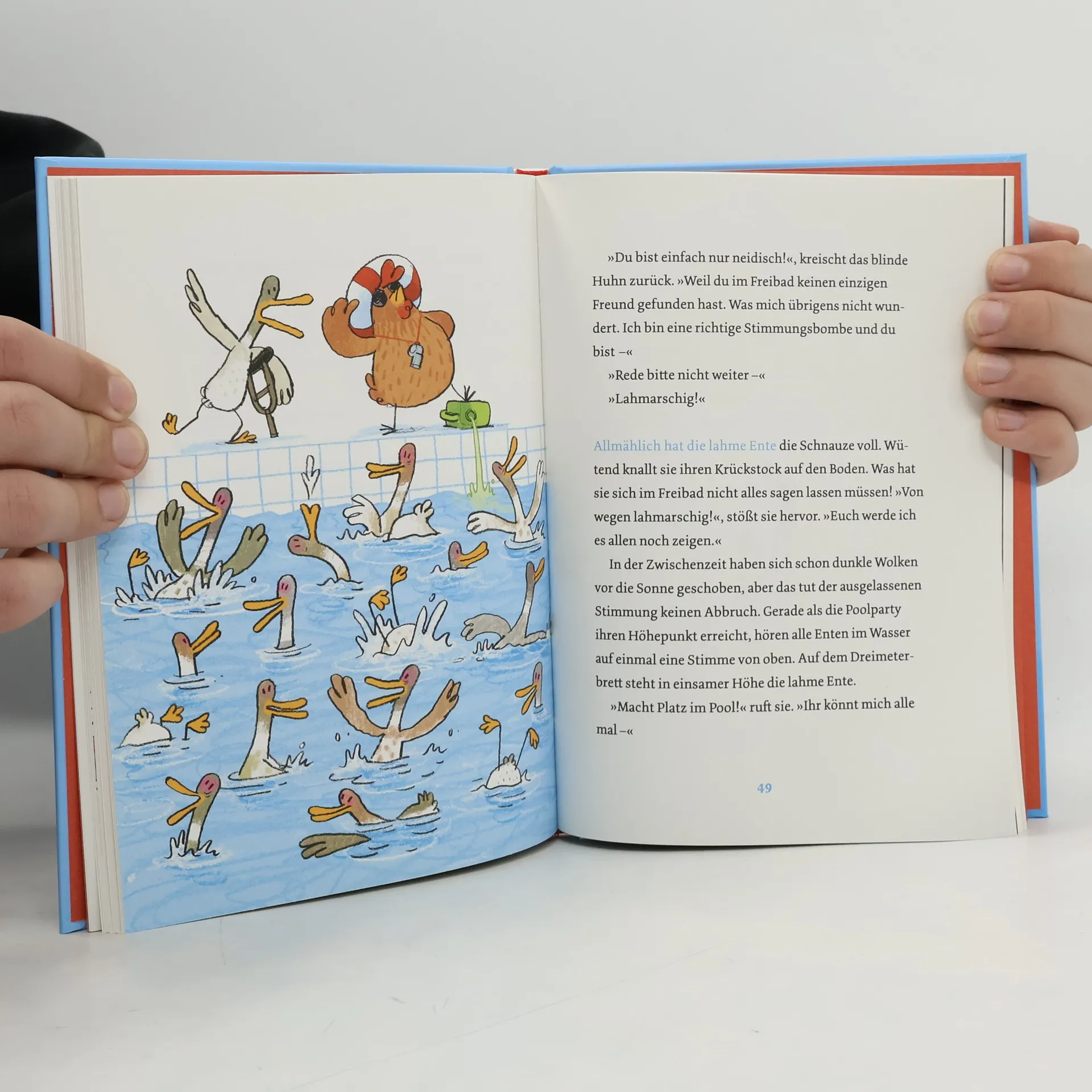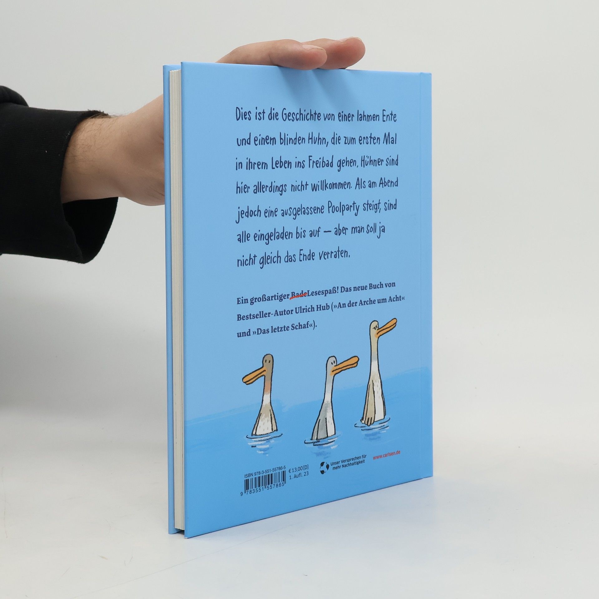 Das perfekte (Vorlese-)Buch für den Familienurlaub: Eigentlich sind lahme Ente und blindes Huhn allerbeste Freunde. Doch als die beiden in einem Freibad auf einen riesigen Haufen Enten stoßen, wird es verzwickt. Während die Ente vergeblich versucht, sich bei ihren Artgenossen beliebt zu machen, spielt sich das Huhn als Bademeister auf – und wird prompt bejubelt. Leider verliert es dabei sein geliebtes Entlein aus dem Blick. Ob eine gekonnte Arschbombe daran etwas ändert? – Eine Geschichte über Freundschaft, Verrat und die Kunst, sich selbst zu akzeptieren.