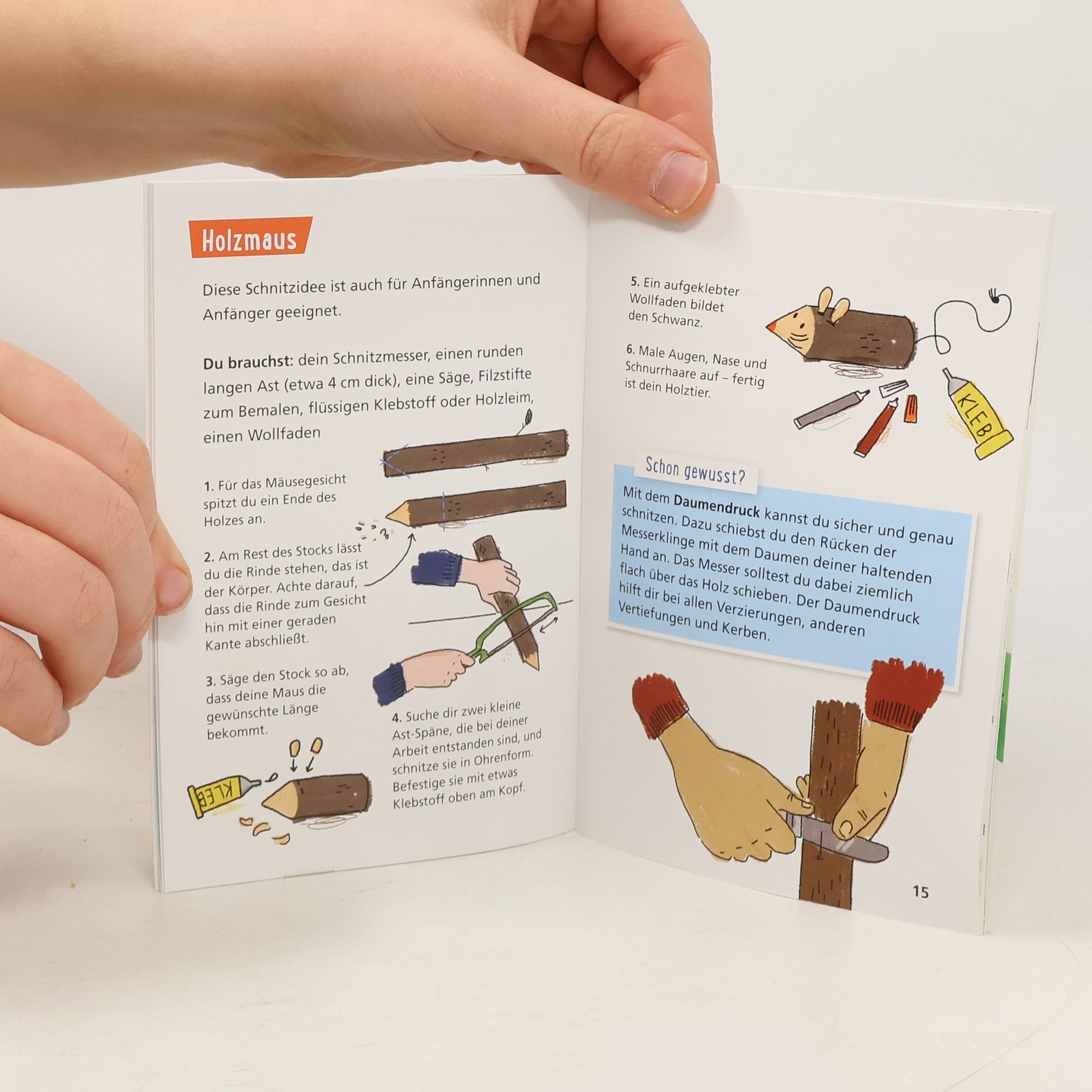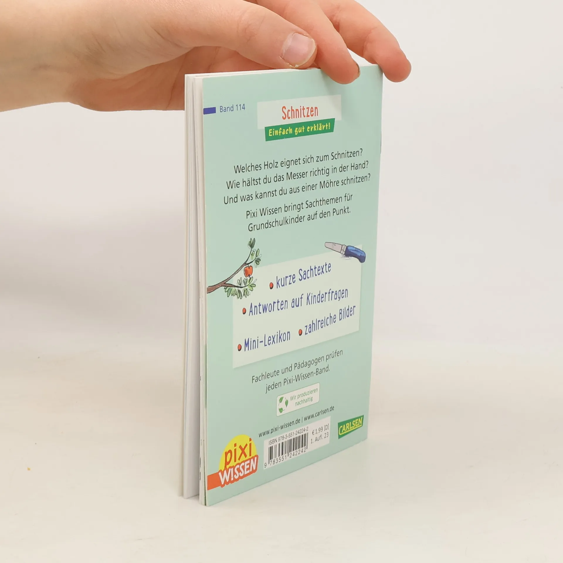 Es braucht nur ein Stück Holz (notfalls reicht auch ein Radieschen) und ein Kinderschnitzmesser und schon kann es losgehen! Schnitzen macht Spaß und mit etwas Vorsicht und Übung können die tollsten Dinge entstehen. Schritt-für-Schritt-Anleitungen für Mäuse, Schwerter, Wichtel und weitere Kunstwerke stehen in Pixi-Wissen-Band 114. Pixi Wissen bringt Sachthemen für Grundschulkinder auf den Punkt. Fachleute und Pädagog*innen prüfen jeden Pixi Wissen-Band. Pixi Wissen. Zum Sammeln, zum Mitnehmen, zum Lernen. Einfach gut erklärt. Für Kinder ab 6 Jahren.
