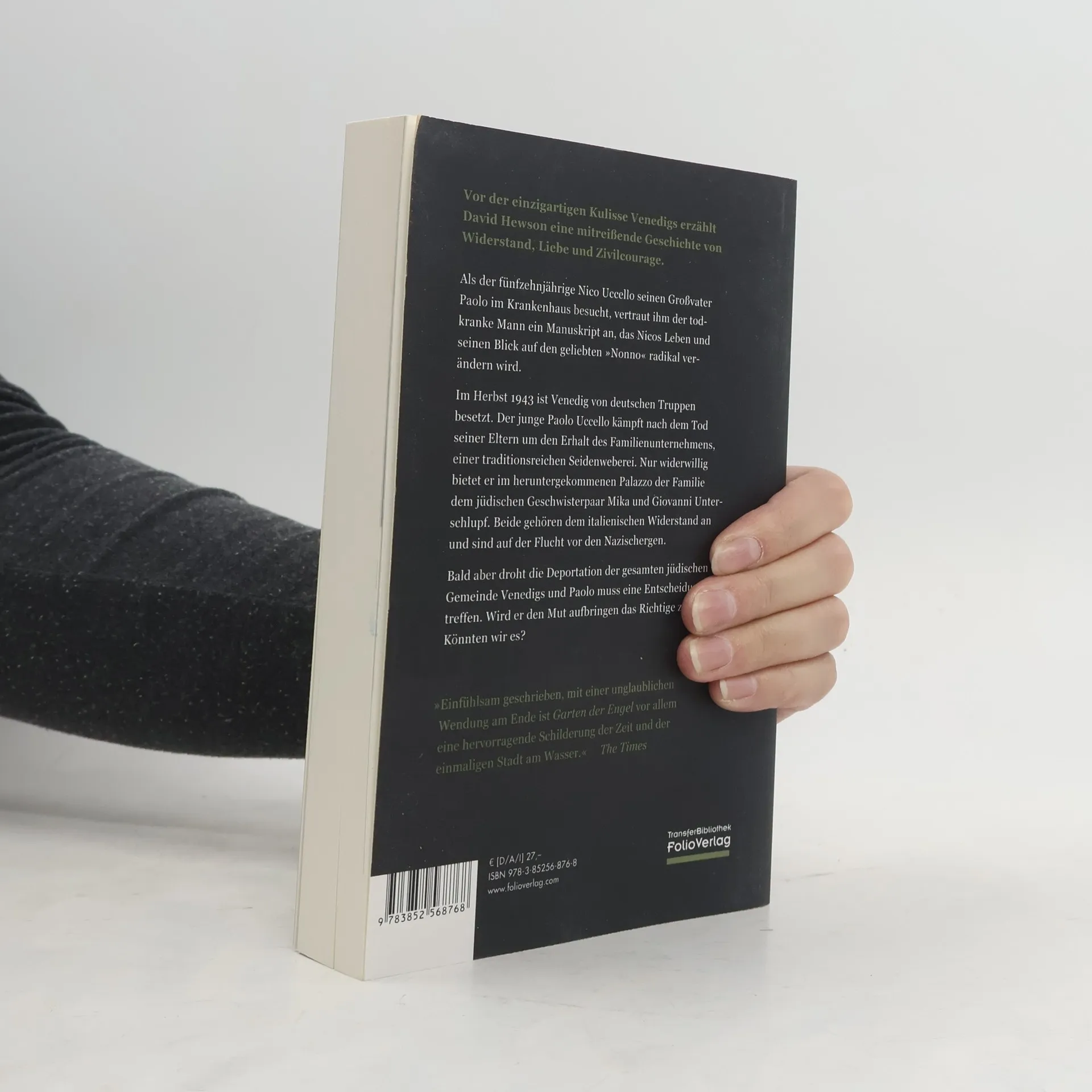 Vor der einzigartigen Kulisse Venedigs erzählt David Hewson eine mitreißende Geschichte von Widerstand, Liebe und Zivilcourage. Als der fünfzehnjährige Nico Uccello seinen Großvater Paolo im Krankenhaus besucht, vertraut ihm der todkranke Mann ein Manuskript an, das Nicos Leben und seinen Blick auf den geliebten „Nonno“ radikal verändern wird. Im Herbst 1943 ist Venedig von deutschen Truppen besetzt. Der junge Paolo Uccello kämpft nach dem Tod seiner Eltern um den Erhalt des Familienunternehmens, einer traditionsreichen Seidenweberei. Nur widerwillig bietet er im heruntergekommenen Palazzo der Familie dem jüdischen Geschwisterpaar Mika und Giovanni Unterschlupf. Beide gehören dem italienischen Widerstand an und sind auf der Flucht vor den Nazischergen. Bald aber droht die Deportation der gesamten jüdischen Gemeinde Venedigs und Paolo muss eine Entscheidung treffen. Wird er den Mut aufbringen, das Richtige zu tun? Könnten wir es? Vom Autor der Bücher zur TV-Serie „Kommissarin Lund – Das Verbrechen“. „Eine der Fragen, die ich beantworten wollte, war: Was bringt einen ganz normalen, nicht besonders heldenhaften Bürger dazu, sein Leben und das seiner Familie zu riskieren, um sich dem Terror entgegenzustellen? Woher kommt dieser Mut?“ (David Hewson)