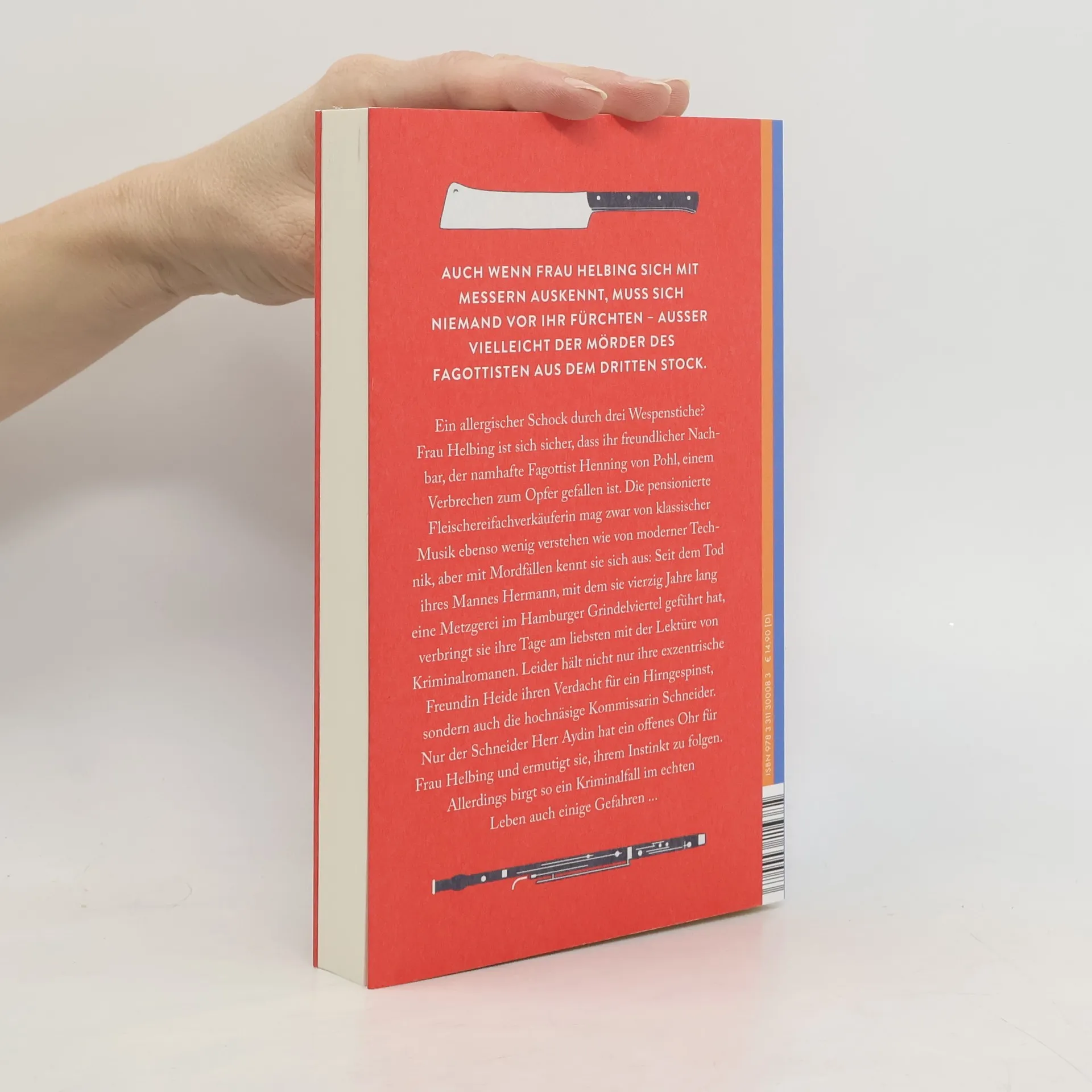 Ein allergischer Schock durch drei Wespenstiche? Frau Helbing ist sich sicher, dass ihr freundlicher Nachbar, der namhafte Fagottist Henning von Pohl, einem Verbrechen zum Opfer gefallen ist. Die pensionierte Fleischereifachverkäuferin mag zwar von klassischer Musik ebenso wenig verstehen wie von moderner Technik, aber mit Mordfällen kennt sie sich aus: Seit Hermanns Tod, mit dem sie vierzig Jahre lang eine eigene Metzgerei im Hamburger Grindelviertel geführt hat, liest sie in ihrer Freizeit am liebsten Kriminalromane. Leider hält nicht nur ihre exzentrische Freundin Heide ihren Verdacht für ein Hirngespinst, sondern auch die hochnäsige Kriminalkommissarin Schneider. Nur der Schneider Herr Aydin hat ein offenes Ohr für Frau Helbing und ermutigt sie, ihrem Instinkt zu folgen. Allerdings birgt so ein Kriminalfall im echten Leben auch einige Gefahren …