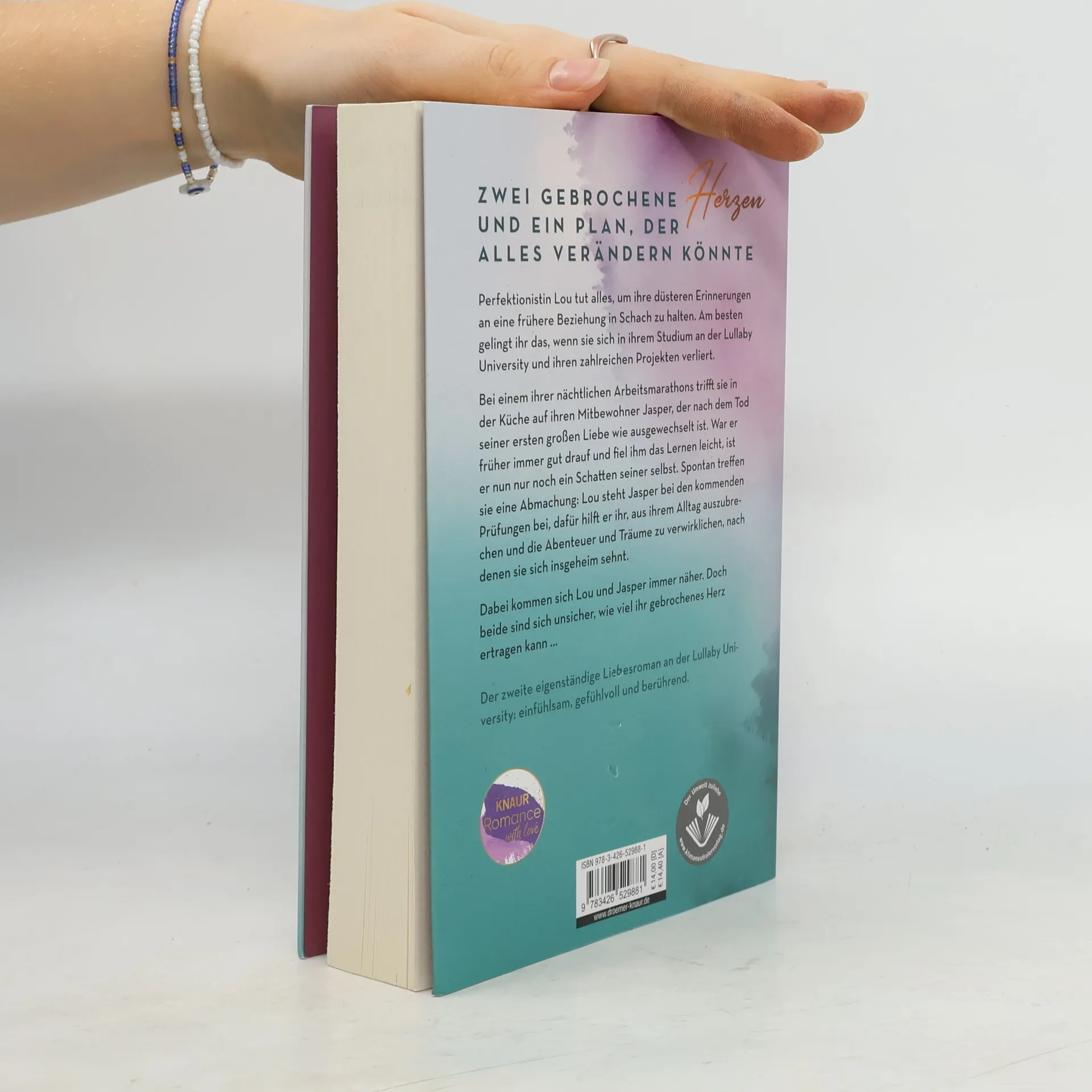 Zwei gebrochene Herzen – ein Plan, der alles verändern könnte … In Jennifer Wileys neuem New-Adult-Roman an der Lullaby University müssen Lou Simson und Jasper Branson sich ihrer Vergangenheit stellen und treffen eine besondere Abmachung. Perfektionistin Lou kämpft, ihre düsteren Erinnerungen an eine frühere Beziehung zu bewältigen. Am besten gelingt ihr das, wenn sie beschäftigt ist, etwa beim nächtlichen Lernen für ihr Umweltmanagement-Studium. Bei einem dieser nächtlichen Marathonarbeiten trifft sie in der Wohnheimküche auf Jasper, der nach dem Verlust seiner ersten großen Liebe verändert ist. War er einst lebensfroh, ist er nun ein Schatten seiner selbst. Aus einigen Albernheiten, die beiden guttun, entsteht ein Plan: Lou hilft Jasper bei seinen Prüfungen, während er ihr zeigt, wie man das Leben genießt. Durch Aktivitäten wie Tanzen im Regen, Hang Gliding und Camping im Modoc National Forest kommen sie sich näher. Doch beide sind unsicher, wie viel ihr gebrochenes Herz ertragen kann. Die Geschichte spielt an einem kleinen, renommierten College in der Nähe eines wunderschönen Nationalparks in Kalifornien und bietet eine emotionale Liebesgeschichte, die von atemberaubender Naturschönheit umgeben ist.