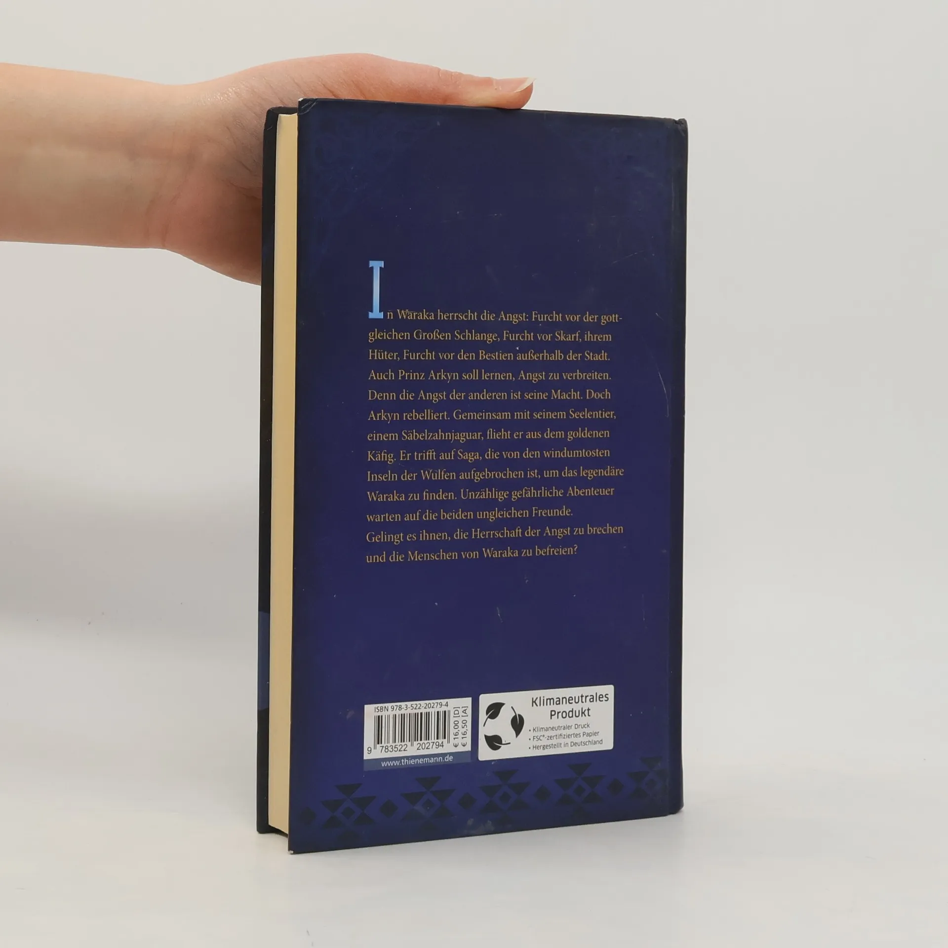 Ein großartiges Epos über die Macht der Angst, ein virtuos erzählter Fantasyroman des preisgekrönten Autors. In Waraka herrscht die Angst: Furcht vor der gottgleichen Großen Schlange, Furcht vor Skarf, ihrem Hüter, Furcht vor den Bestien außerhalb der Stadt. Auch Prinz Arkyn soll lernen, Angst zu verbreiten. Denn die Angst der anderen ist seine Macht. Doch Arkyn rebelliert. Gemeinsam mit seinem Seelentier, einem Säbelzahnjaguar, flieht er aus dem goldenen Käfig. Er trifft auf Saga, die von den windumtosten Inseln der Wulfen aufgebrochen ist, um das legendäre Waraka zu finden. Unzählige gefährliche Abenteuer warten auf die beiden ungleichen Freunde. Gelingt es ihnen, die Herrschaft der Angst zu brechen und die Menschen von Waraka zu befreien? Zwei Jugendliche aus völlig unterschiedlichen Kulturen kämpfen gemeinsam für Freiheit und Gerechtigkeit.
