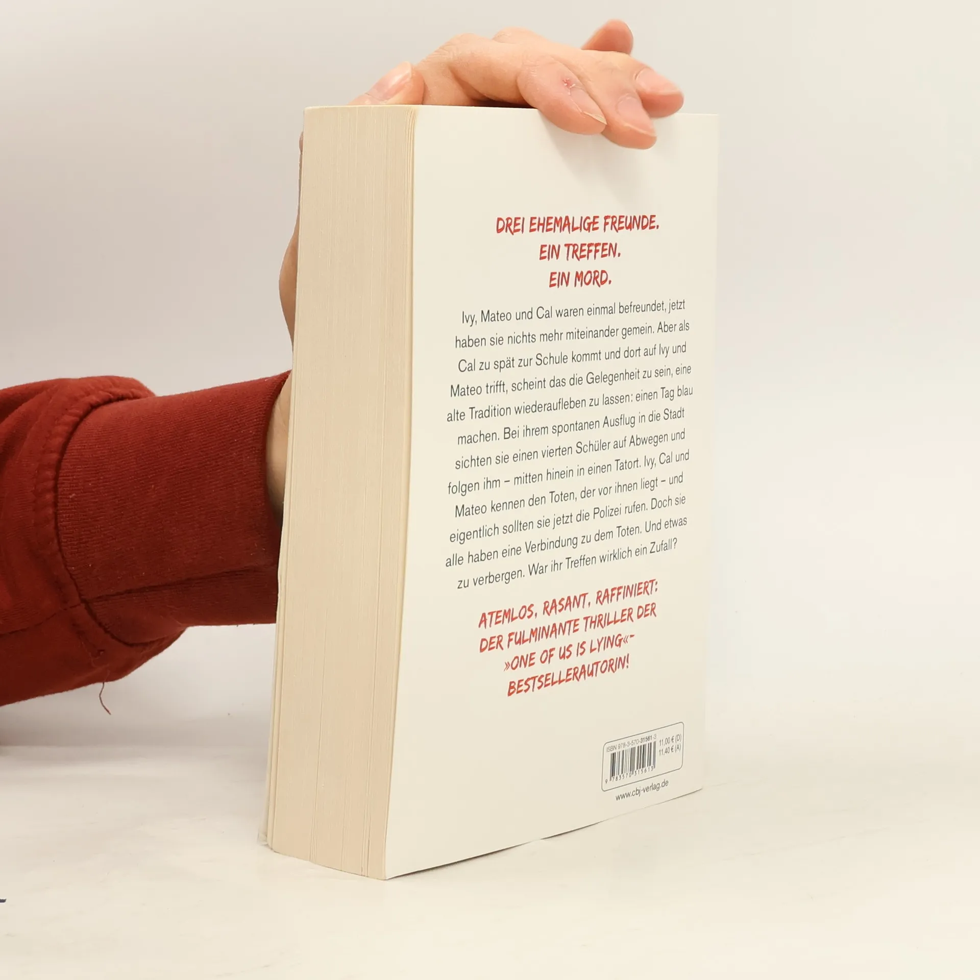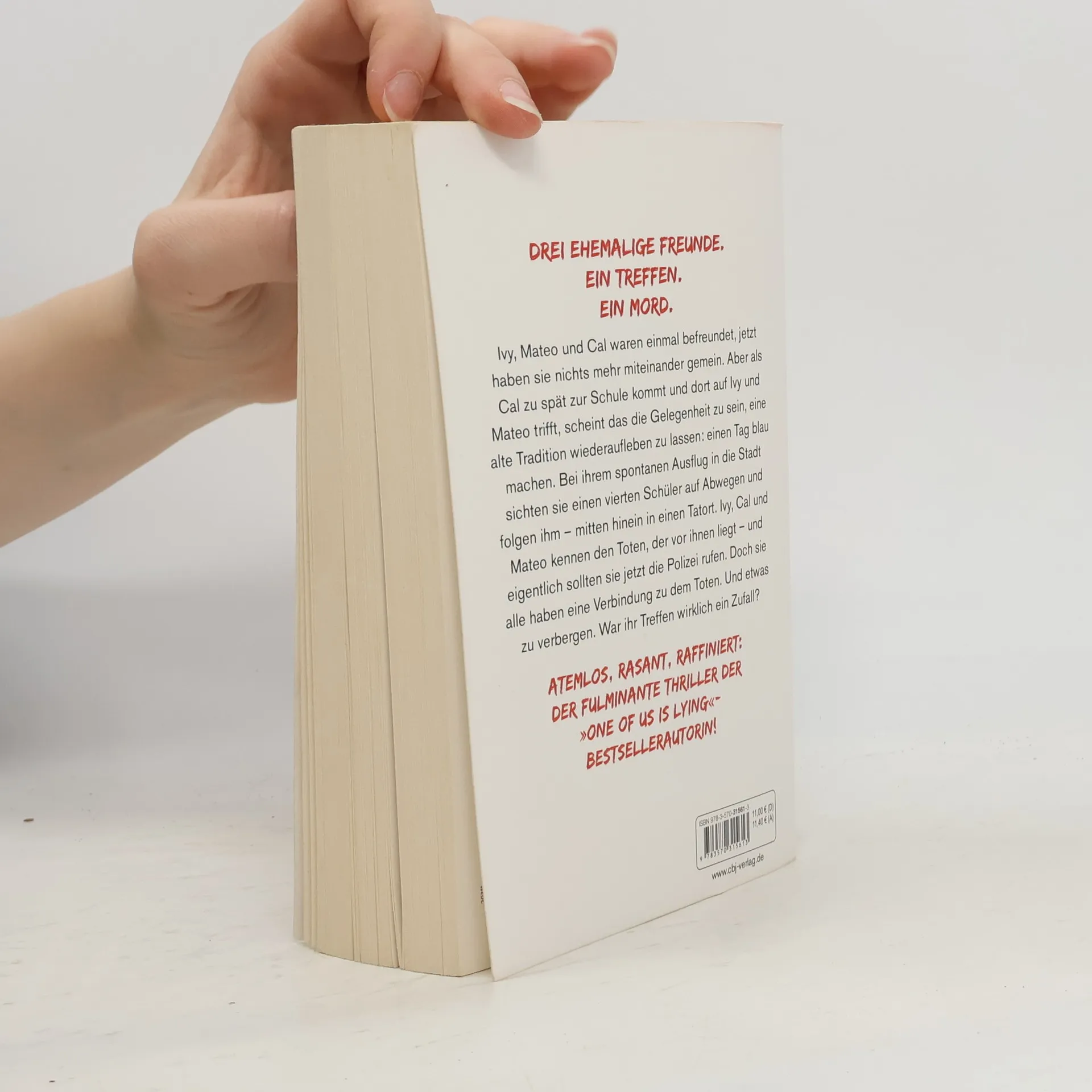 Drei ehemalige Freunde. Ein Zufallstreffen. Ein Mord. Ivy, Mateo und Cal waren einmal befreundet, jetzt haben sie nichts mehr miteinander gemein. Aber als Cal zu spät zur Schule kommt und dort auf Ivy und Mateo trifft, scheint das die Gelegenheit zu sein, eine alte Tradition wiederaufleben zu lassen: einen Tag blau machen. Bei ihrem spontanen Ausflug in die Stadt sichten sie einen vierten Schüler auf Abwegen und folgen ihm – mitten hinein in einen Tatort. Ivy, Cal und Mateo kennen den Toten, der vor ihnen liegt – und eigentlich sollten sie jetzt die Polizei rufen. Doch sie alle haben eine Verbindung zu dem Toten. Und etwas zu verbergen. War ihr Zufallstreffen wirklich ein Zufall? Rasant, sexy, umwerfend: der neue raffinierte Thriller von der Weltbestsellerautorin von »One of us is lying«! Mit meisterhaft geplotteten Wendungen und einnehmenden, komplexen Figuren garantieren McManus' Bücher eine Suchtgefahr, der man sich nicht entziehen kann. Weitere Romane von Karen M. McManus bei cbj & cbt: One Of Us Is Lying Two Can Keep A Secret One Of Us Is Next The Cousins Nothing more to tell One of us is back Alle Bücher können unabhängig voneinander gelesen werden.