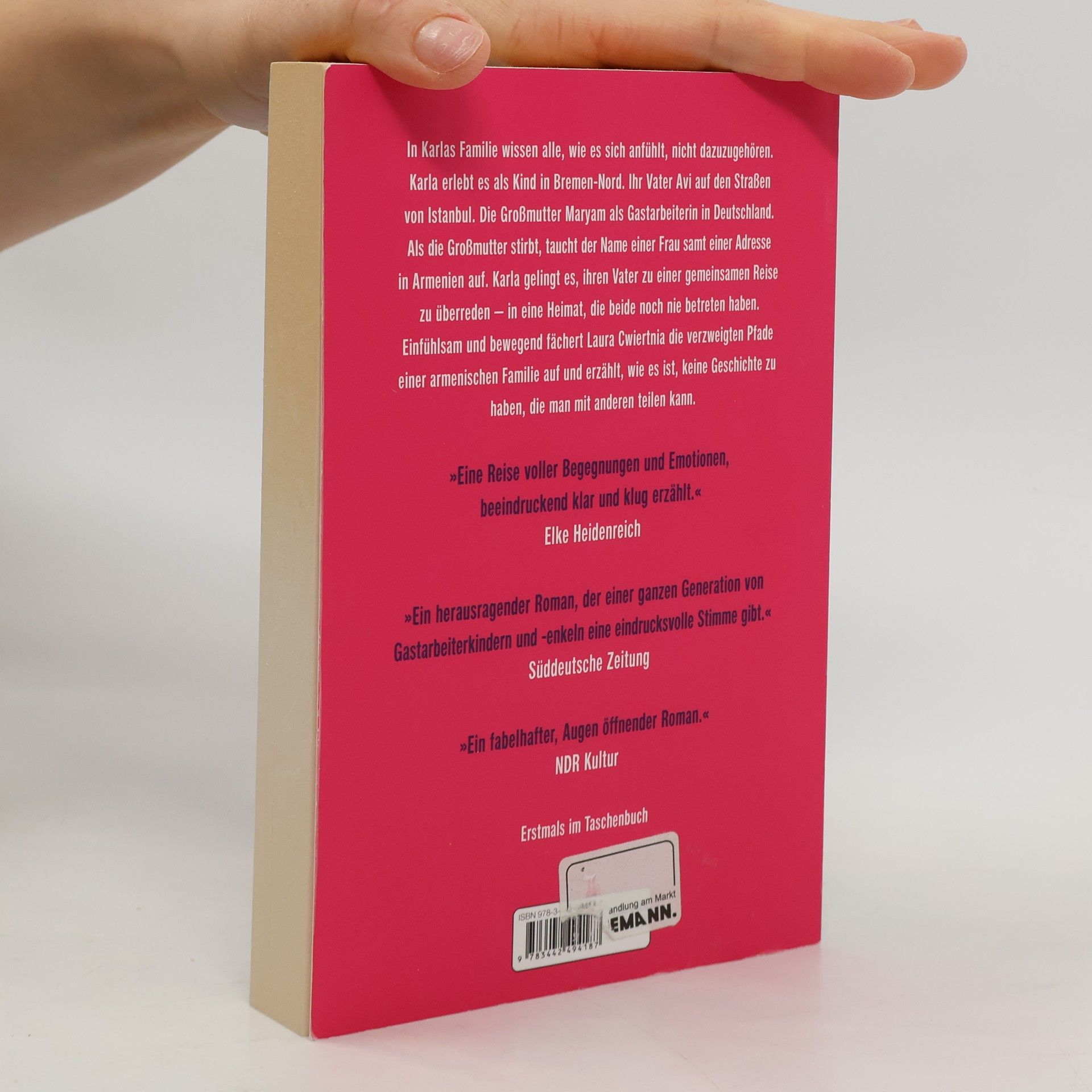 Wie lange dauert es, bis aus einem Zuhause eine Heimat wird? In Karlas Familie wissen alle, wie es sich anfühlt, nicht dazuzugehören. Karla erlebt es als Kind in Bremen-Nord. Ihr Vater Avi in einer Klosterschule in Jerusalem. Die Großmutter Maryam als Gastarbeiterin in Deutschland. Als Karlas Großmutter stirbt, taucht der Name einer Frau samt einer Adresse in Armenien auf. Karla gelingt es, ihren Vater zu einer gemeinsamen Reise zu überreden – in eine Heimat, die beide noch nie betreten haben. Eindrücklich und bewegend erzählt Laura Cwiertnia davon, wie es sich anfühlt, am Rand einer Gesellschaft zu stehen. Und davon, wie es ist, keine Geschichte zu haben, die man mit anderen teilen kann.