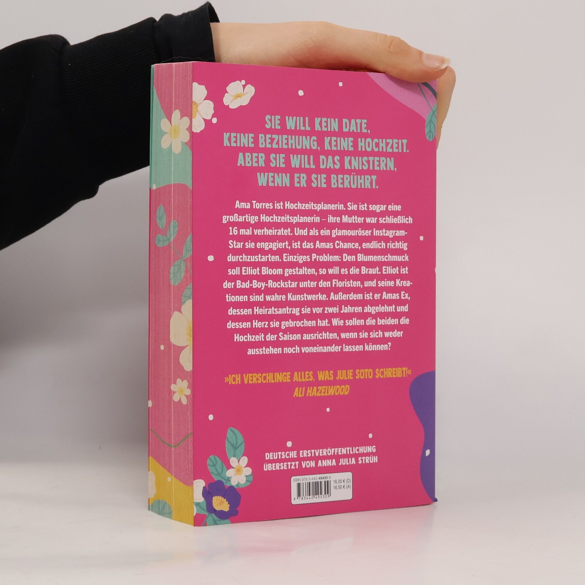 Mit wunderschön farbig gestaltetem Buchschnitt Ama Torres ist Hochzeitsplanerin. Sie ist sogar eine großartige Hochzeitsplanerin – ihre Mutter war schließlich sechzehnmal verheiratet. Und als ein glamouröser Instagram-Star sie engagiert ist das Amas Chance, endlich richtig durchzustarten. Einziges Problem: Den Blumenschmuck soll Elliot Blum gestalten, so will es die Braut. Elliot ist der Bad-Boy-Rockstar unter den Floristen, und seine Kreationen sind wahre Kunstwerke. Außerdem ist er Amas Ex, dessen Heiratsantrag sie vor zwei Jahren abgelehnt und dessen Herz sie gebrochen hat. Wie sollen die beiden die Hochzeit der Saison ausrichten, wenn sie sich weder ausstehen noch voneinander lassen können?