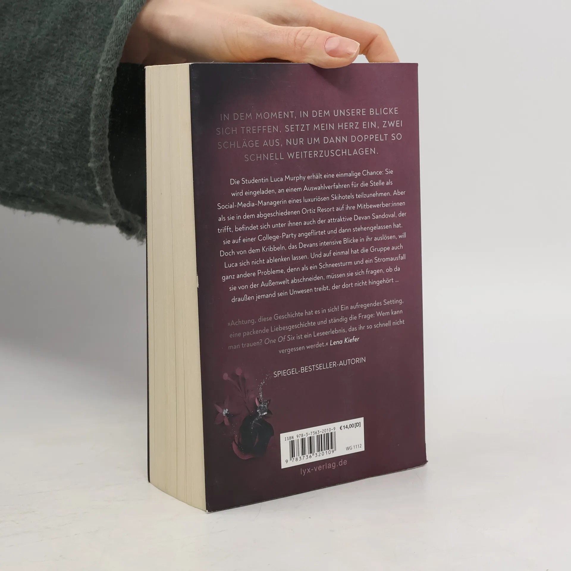 In dem Moment, in dem unsere Blicke sich treffen, setzt mein Herz ein, zwei Schläge aus, nur um dann doppelt so schnell weiterzuschlagen. Die Studentin Luca Murphy erhält eine einmalige Chance: Sie wird eingeladen, an einem Auswahlverfahren für die Stelle als Social-Media-Managerin eines luxuriösen Skihotels teilzunehmen. Aber als sie in dem abgeschiedenen Ortiz Resort auf ihre Mitbewerber: innen trifft, befindet sich unter ihnen auch der attraktive Devan Sandoval, der sie auf einer College-Party angeflirtet und dann stehengelassen hat. Doch von dem Kribbeln, das Devans intensive Blicke in ihr auslösen, will Luca sich nicht ablenken lassen. Und auf einmal hat die Gruppe auch ganz andere Probleme, denn als ein Schneesturm und ein Stromausfall sie von der Außenwelt abschneiden, müssen sie sich fragen, ob da draußen jemand sein Unwesen treibt, der dort nicht hingehört ... »Achtung, diese Geschichte hat es in sich! Ein aufregendes Setting, eine packende Liebesgeschichte und ständig die Frage: Wem kann man trauen? ONE OF SIX ist ein Leseerlebnis, das ihr so schnell nicht vergessen werdet.« LENA KIEFER Erster Band der ONE OF SIX Reihe von SPIEGEL -Bestseller-Autorin Kim Nina Ocker