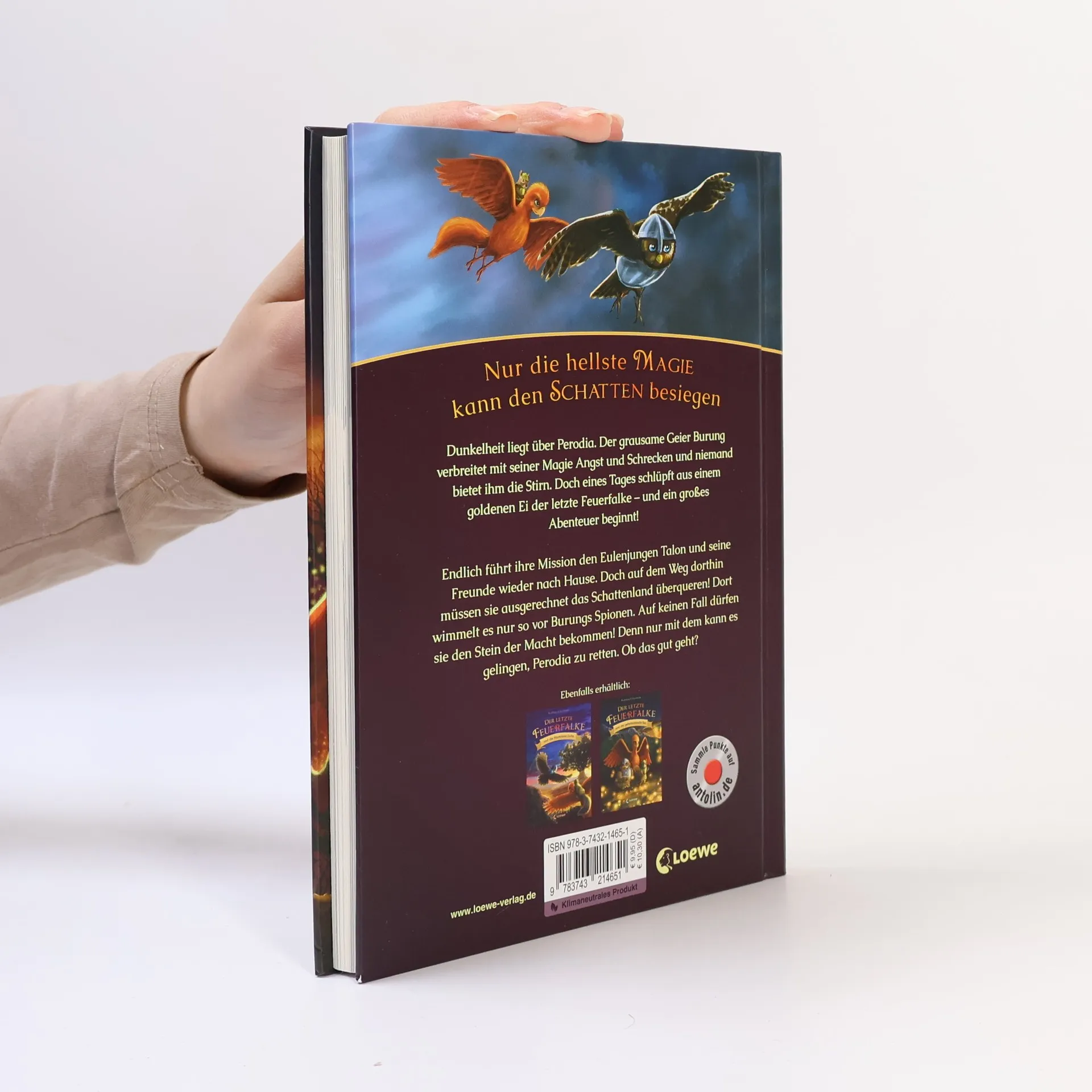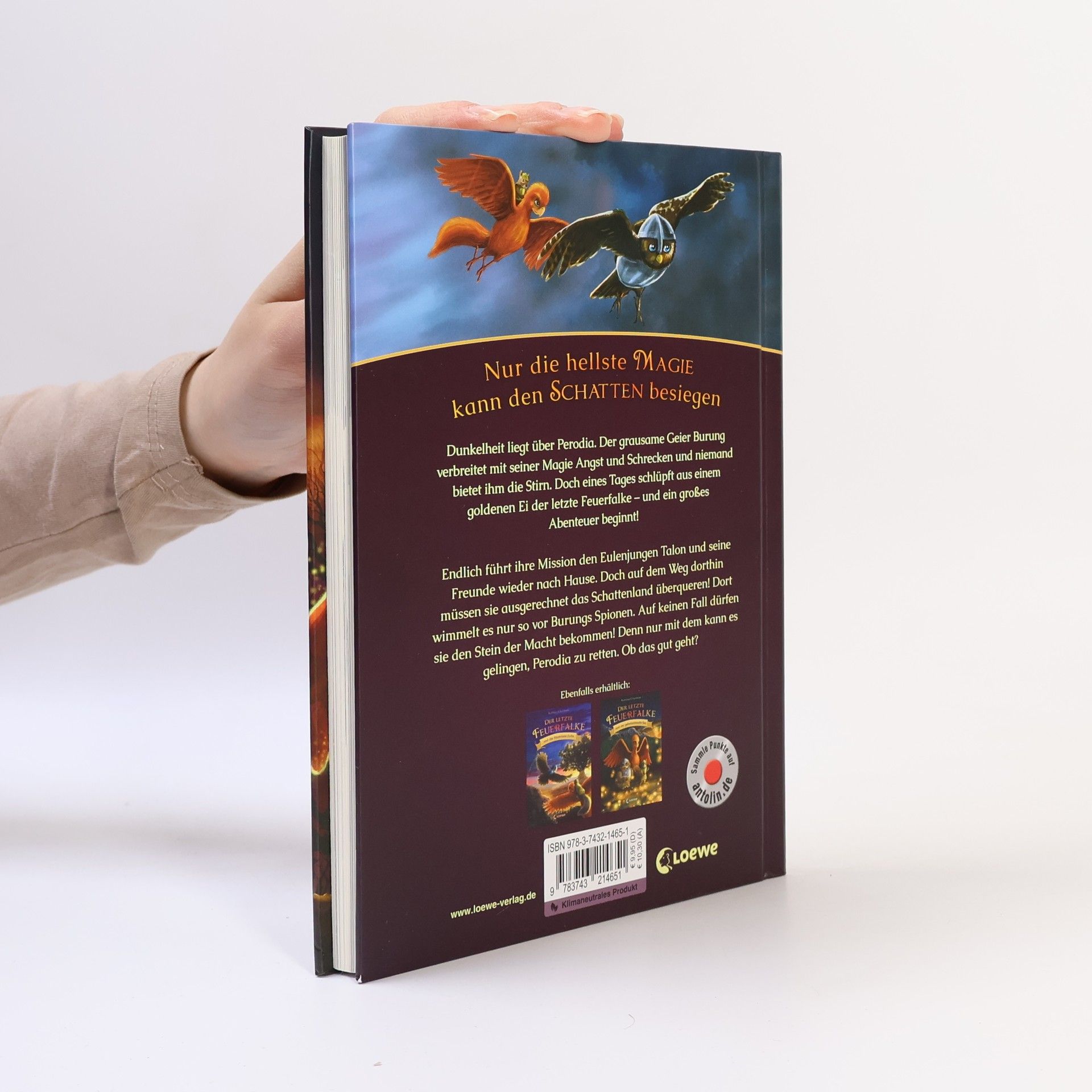 Nur die hellste Magie kann den Schatten besiegen. Dunkelheit liegt über Perodia. Der grausame Geier Burung verbreitet mit seiner Magie Angst und Schrecken. Niemand bietet ihm die Stirn. Doch eines Tages schlüpft aus einem goldenen Ei der letzte Feuerfalke – und ein großes Abenteuer beginnt! Endlich führt ihre Mission den Eulenjungen Talon und seine Freunde wieder nach Hause. Doch auf dem Weg dorthin müssen sie ausgerechnet das Schattenland überqueren! Dort wimmelt es nur so von Burungs Spionen. Auf keinen Fall dürfen sie den Stein der Macht bekommen! Denn nur mit dem kann es gelingen, Perodia zu retten. Ob das gut geht? Begleite Talon, Agila und Ruby auf ihrer gefährlichen Reise! Actionreiche Tierfantasy Spannendes Abenteuer für Kinder ab 7 Jahren Geeignet zum Vorlesen und ersten Selberlesen Mit tollen Illustrationen auf jeder Seite Episch wie Tolkiens Hobbit Gut gegen Böse Kurze Kapitel Beliebte Tiere: Eulen Hochwertiges Hardcover Der Titel ist auf Antolin gelistet. Klimaneutrales Produkt – Wir unterstützen ausgewählte Klimaprojekte!