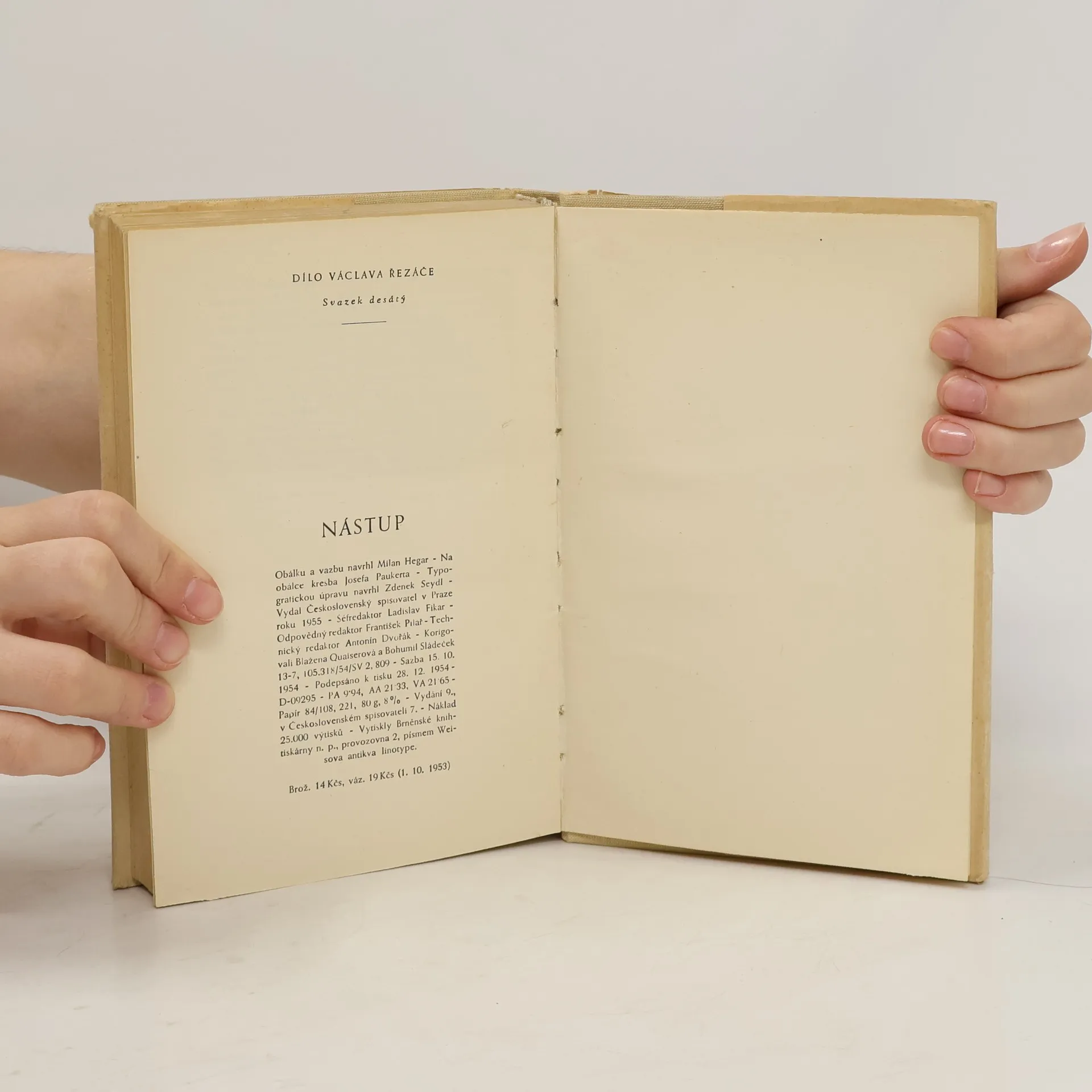 První část zamýšlené rom. trilogie o budování pohraničí. Děj se odehrává v městečku Potočná, počíná květnem 1945, nástupem několika Čechů do zcela něm. prostředí a je doveden do podzimu téhož roku. Na otázku, jakou měrou jsou postavy rom. (vyniká zvl. uvědomělý komunista Bagár)přepisem skutečnosti, Řezáč odpověděl: "Vyznávám zásadu onoho gorkovského: ze sta popů jeden pop. Všechny podstatné složky naší společnosti, které se podílely na osídlení pohraničí a na jeho budování, ať už to byli dělníci (zde textiláci), zemědělci (rodina býv. podruhy Postavy), inteligenti (trochu komický, ale čestný poštmistr-rusofil, nadšený ctitel husitské tradice a posléze komunista), mají v Nástupu representanty. Chtěl bych zdůraznit, že jsem je viděl nejen jako lidi, kteří sem přišli, aby se tu usídlili a zařídili si lepší život, ale především jako nositele nového společenského řádu, který tu sami budou vytvářet. Porostou ve své pracovní povinnosti, budou se tím měnit, budou lepší a krásnější." V kontrastu k těmto budovatelům socialismu vystupují v rom. i kořistníci, kteří v honbě za majetkem jsou ochotni spojit se s nacisty (postava "nár. správce" textilky Trnce).