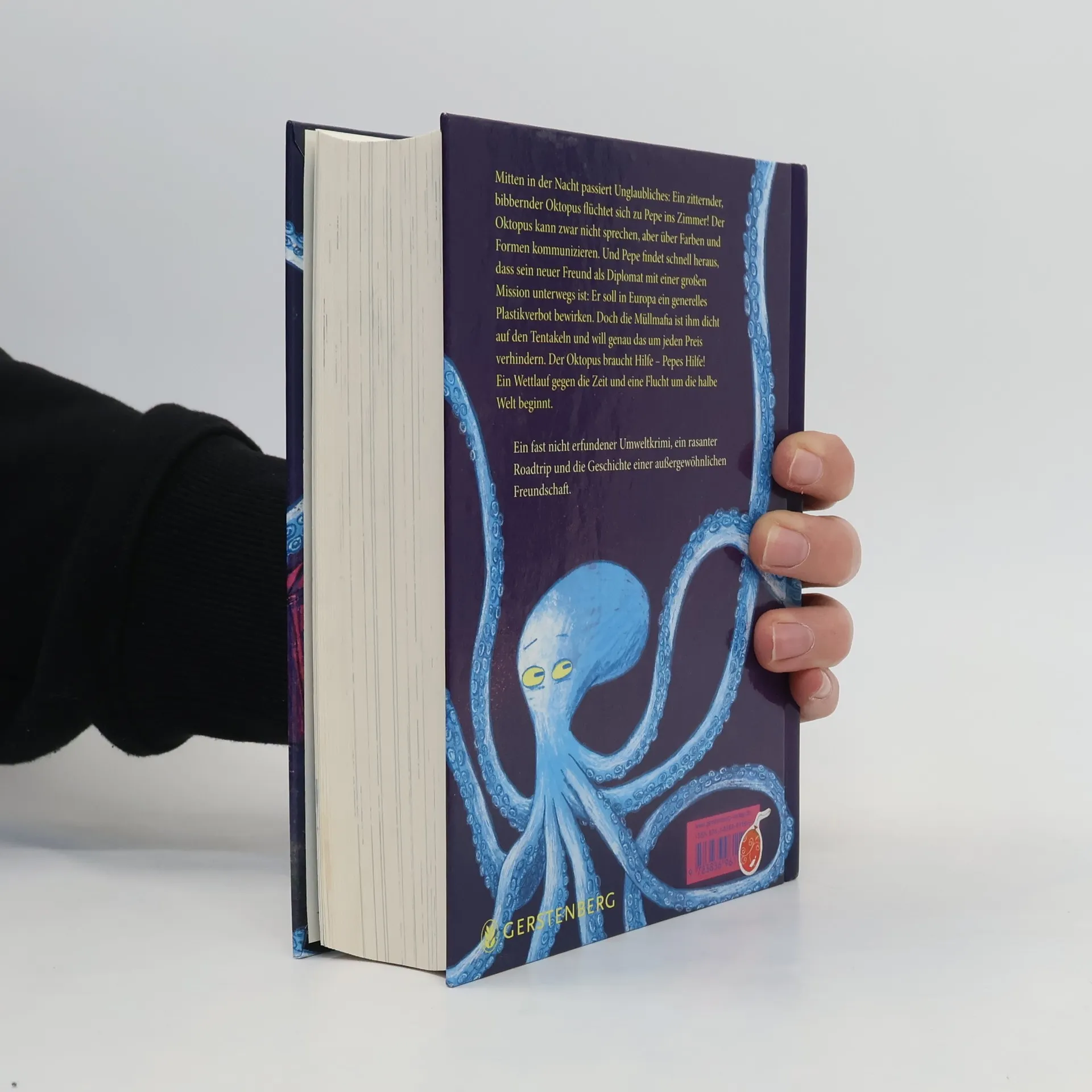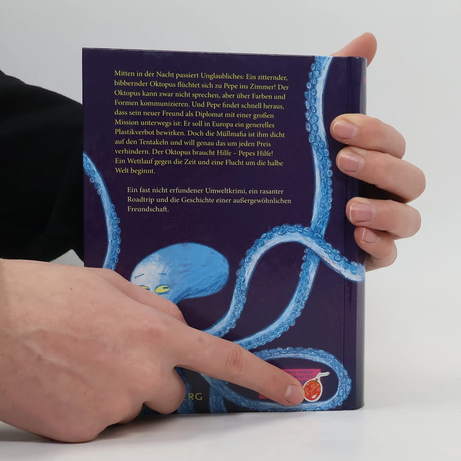 Mitten in der Nacht passiert Unglaubliches: Ein zitternder, bibbernder Oktopus flüchtet sich zu Pepe ins Zimmer! Der Oktopus kann zwar nicht sprechen, aber über Farben und Formen kommunizieren. Und Pepe findet schnell heraus, dass es sich bei seinem neuen Freund um den ranghöchsten Diplomaten der Welt-meere handelt: Er soll in Europa ein generelles Plastikverbot bewirken. Doch die Müllmafia ist ihm dicht auf den Tentakeln und will genau das um jeden Preis verhindern. Der Oktopus braucht Hilfe – Pepes Hilfe! Ein Wettlauf gegen die Zeit beginnt. Dass ihre Flucht sie durch die halbe Welt bis ans Südchinesische Meer führen wird, kann Pepe noch nicht ahnen … Ein fast nicht erfundener Umweltkrimi, ein rasanter Roadtrip von hier bis China und die Geschichte einer außergewöhnlichen Freundschaft.