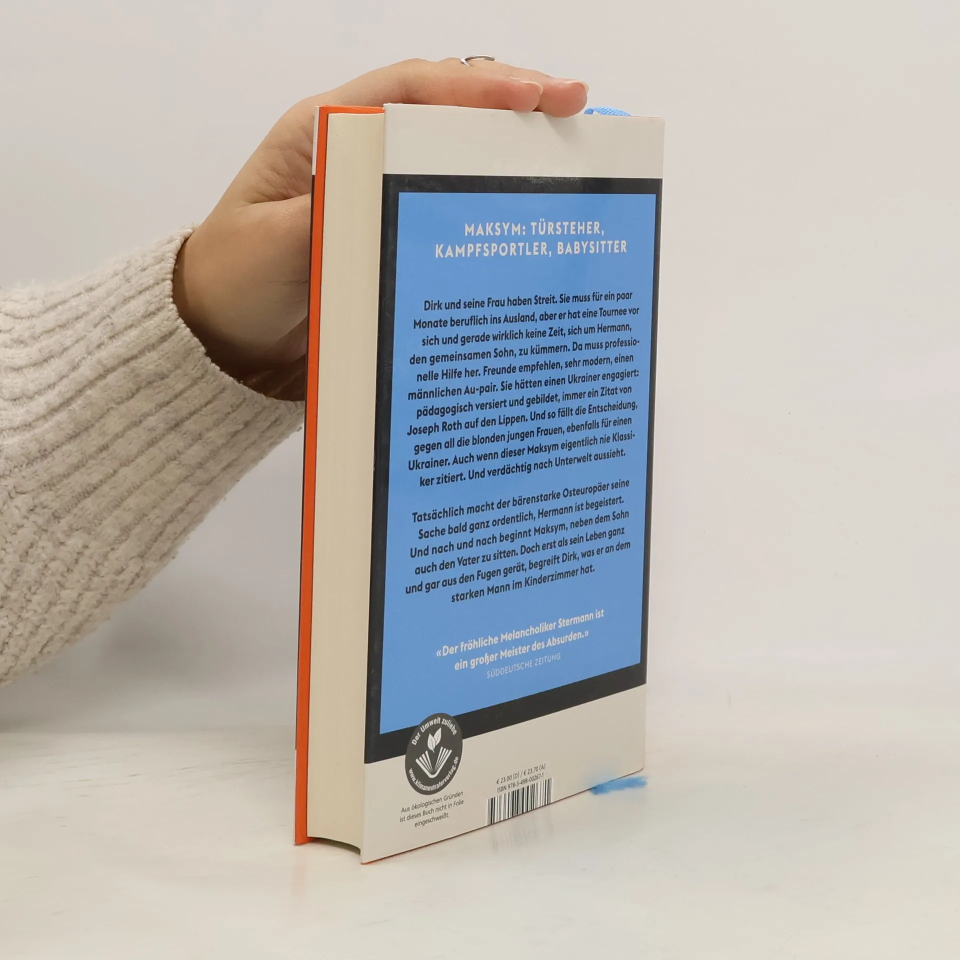 Dirk Stermanns Roman «Sechs Österreicher unter den ersten fünf», der sich allein in Österreich über hundertfünfzigtausendmal verkaufte, hatte einen Helden namens Dirk Stermann. Nun hat der Autor ein neues Buch über diesen Mann geschrieben. Es beginnt wie eine amüsante Gesellschaftssatire aus dem heutigen Wien: Dirk und seine Frau stehen vor einem Problem. Sie muss für ein paar Monate beruflich ins Ausland, aber er hat jetzt wirklich keine Zeit, sich den ganzen Tag um den gemeinsamen Sohn, Hermann, zu kümmern. Professionelle Hilfe muss also her. Freunde empfehlen, sehr modern, einen männlichen Babysitter. Sie hätten einen Ukrainer, sehr erfahren und gebildet, immer ein Zitat von Joseph Roth auf den Lippen. Und Dirk entscheidet sich, gegen all die blonden jungen Frauen, ebenfalls für einen Ukrainer. Auch wenn Maksym eigentlich nie Klassiker zitiert. Und erst macht der schweigsame Osteuropäer seine Sache auch ganz gut. Aber dann beginnt er, neben dem Sohn auch den Vater zu sitten. Und von da an scheint es nur noch eine Richtung zu geben: abwärts. Ein Roman, wie ihn nur Dirk Stermann schreiben kann: komisch, grausig, herzerwärmend.