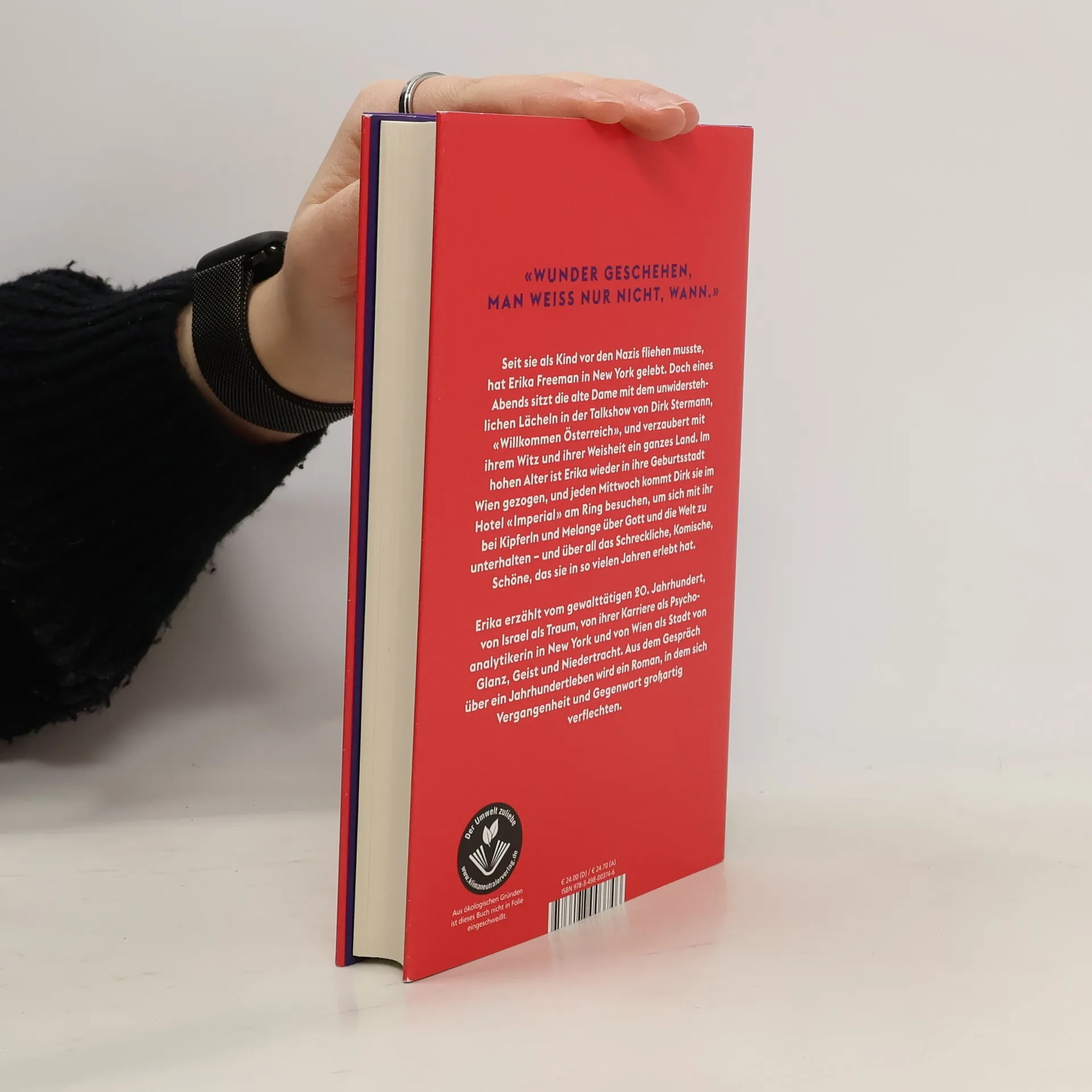 Fast ihr ganzes Leben hat Erika Freeman in New York verbracht, dann sitzt sie eines Abends in der Talkshow von Dirk Stermann, «Willkommen, Österreich», und verzaubert ihren Gastgeber und die Nation. Im hohen Alter lebt sie wieder in ihrer Heimatstadt Wien, jeden Mittwoch kommt Dirk sie nun besuchen, um sich mit ihr bei Kipferln und Melange über Gott und die Welt zu plaudern, und aus diesem erzählten Jahrhundertleben einen so amüsanten wie bewegenden Roman zu machen Geboren 1927, ist Erika mit 12 Jahren vor den Nazis nach New York geflohen. Sie wächst in einem Waisenhaus auf, hat Anteil an der Gründung Israels und wird nach dem Studium Psychoanalytikerin; ganz auf sich gestellt, ihre Mutter hat den Krieg nicht überlebt. Ihr Vater, vermeintlich im KZ gestorben, glaubt seinerseits, als Einziger der Familie überlebt zu haben, bis er mitten auf dem Broadway seinen Bruder trifft. Als Therapeutin ist Erika bald eine Berühmtheit, die Riege ihrer berühmten Patienten reicht von Washington bis Hollywood. Nun, mit 95, ist sie wieder Österreicherin geworden, residiert im berühmten Hotel Imperial, wo einst Hitler nächtigte, und wenn man sie fragt, wie es ihr geht, sagt sie: «Gut. Wenn nicht heute, dann morgen.»
