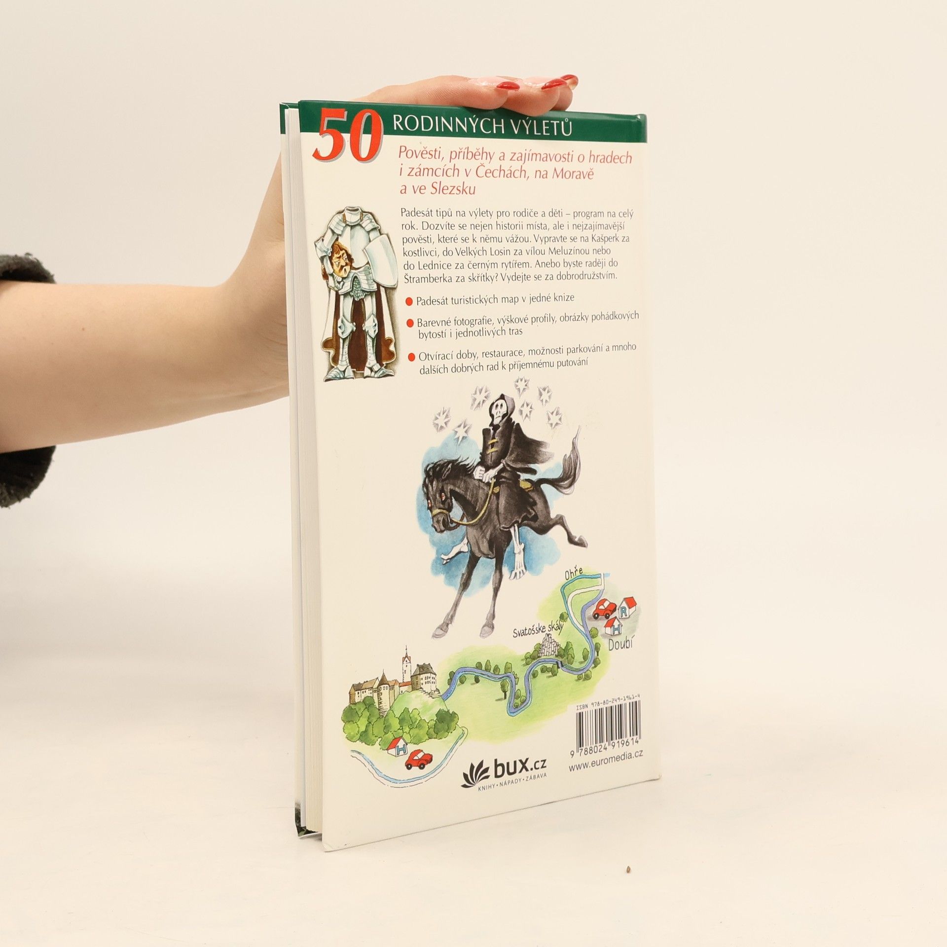 Padesát tipů na rodinné výlety po hradech a zámcích celé republiky. Dozvíte se nejen základní historii místa, ale i nejzajímavější pověsti, které se k němu vážou. Vydejte se do Horšovského Týna za bílou paní, na Kašperk za kostlivci, do Velkých Losin za vílou Meluzínou nebo do Lednice za černým rytířem. Anebo byste raději do Štramberka za skřítky? U každého výletu je kreslená mapka s vyznačenou trasou a výškový profil.
