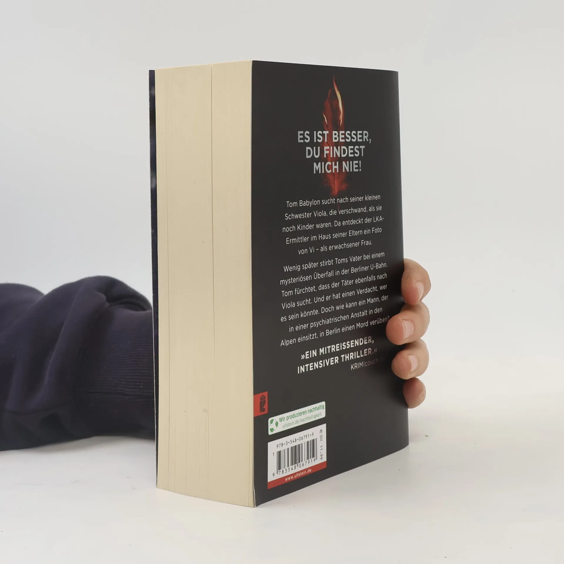 Es ist besser, du findest mich nie LKA-Ermittler Tom Babylon ist wie elektrisiert. Seit vielen Jahren sucht er nach seiner kleinen Schwester Vi. Und plötzlich gibt es einen Hinweis: Ein Foto von Viola als erwachsene Frau, das er im Keller seines Elternhauses findet. Wenig später kommt Toms Vater bei einem mysteriösen Überfall in der Berliner U-Bahn ums Leben. Tom fürchtet, auch der Täter ist auf der Suche nach Viola. Und er hat einen Verdacht, wer es sein könnte: sein früherer Mentor Dr. Walter Bruckmann, der geschworen hat, ihm das Leben zur Hölle zu machen. Doch wie kann ein Mann, der seit seiner Verurteilung in einer psychiatrischen Anstalt in den Alpen einsitzt, in Berlin einen Mord verüben? »Ohne Zweifel ist Marc Raabe einer der besten Thriller-Autoren Deutschlands. Die Tom-Babylon-Reihe hat längst Kultstatus erreicht. Wer den Autor noch nicht kennt, sollte dies schnell ändern. „Violas Versteck“ ist ein mitreißender, intensiver Thriller, der den krönenden Abschluss der packenden Reihe um Tom Babylon und Sita Johanns darstellt.« KRIMIcouch. de Marc Raabe enführt Sie in diesem Thriller in ein packendes Kopfkino. Band 4 der Tom Babylon-Serie. Verpassen Sie nicht Band 1 bis 3!
