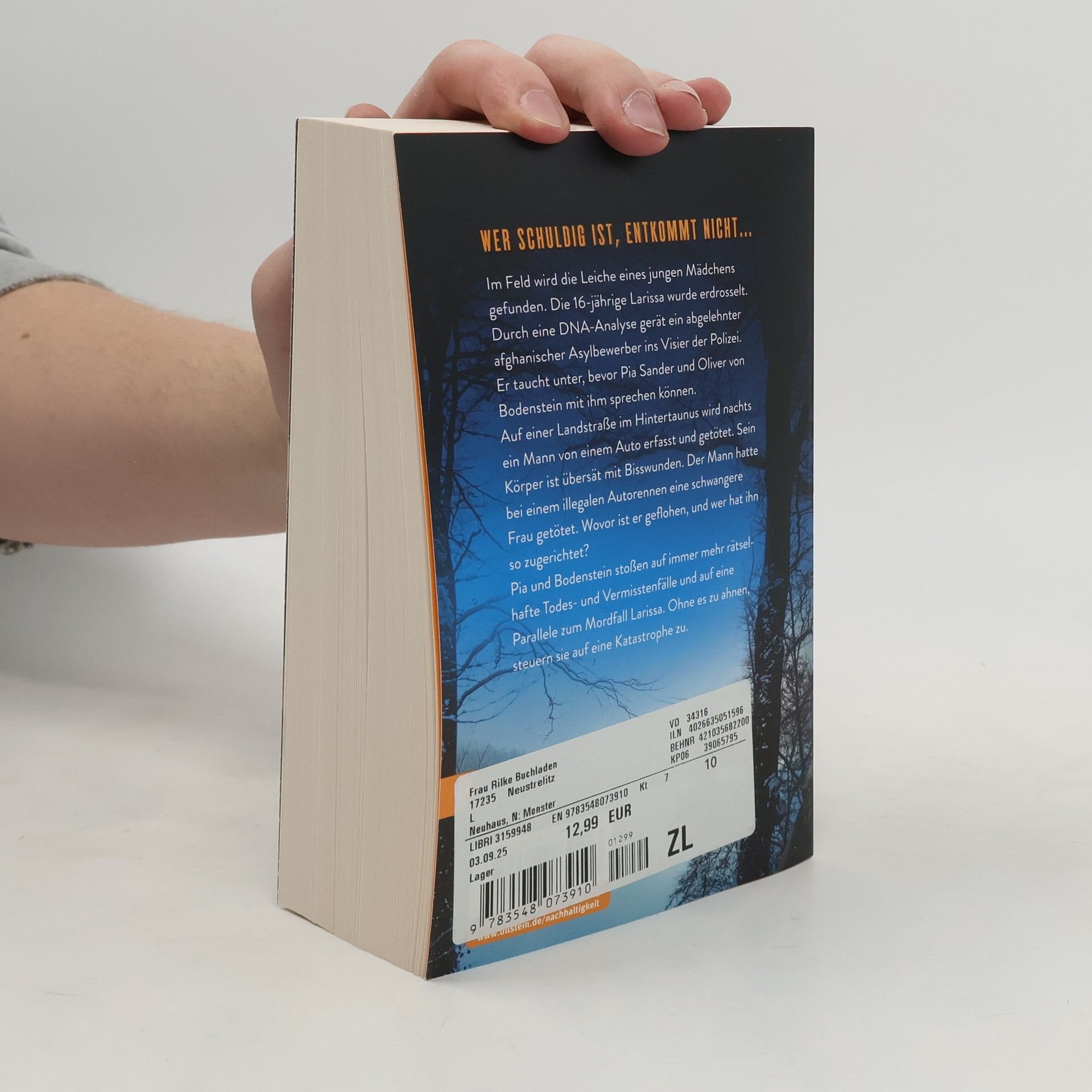 Ein weiterer Platz 1 der SPIEGEL-Bestsellerliste: aufwühlend, originell und brandaktuell! »Packend und temporeich erzählt von der deutschen Queen of Crime, die sich von echten Kriminalfällen inspirieren ließ!« Rhein-Neckar-Zeitung Wer schuldig ist, entkommt nicht… Im Feld wird die Leiche eines jungen Mädchens gefunden. Die 16-Jährige Larissa wurde erdrosselt. Durch eine DNA-Analyse gerät ein abgelehnter afghanischer Asylbewerber, der erst zu einer Haftstrafe verurteilt, aber nach einer Haftbeschwerde auf freien Fuß gesetzt wurde, ins Visier der Polizei. Er kann untertauchen, bevor Pia Sander und Oliver von Bodenstein mit dem Mann sprechen können. Auf einer Landstraße im Hintertaunus wird nachts ein Mann von einem Auto erfasst und getötet. Sein Körper ist übersät mit Bisswunden, sein Gesicht entstellt. Der Mann hatte bei einem illegalen Autorennen eine schwangere Frau getötet. Wovor ist er geflohen und wer hat ihn so zugerichtet? Pia und Bodenstein stoßen auf immer mehr rätselhafte Todes- und Vermisstenfälle und auf eine Parallele zum Mordfall Larissa. Ohne es zu ahnen, steuern sie auf eine Katastrophe zu. »Klare Leseempfehlung für kalte Wintertage« Express am Sonntag *** Der neuste Taunus-Krimi: Gänsehautgarantie! Machen Sie sich gefasst, das Buch in einer Nacht zu verschlingen. Für Nele Neuhaus Fans und Krimi-Begeisterte! ***