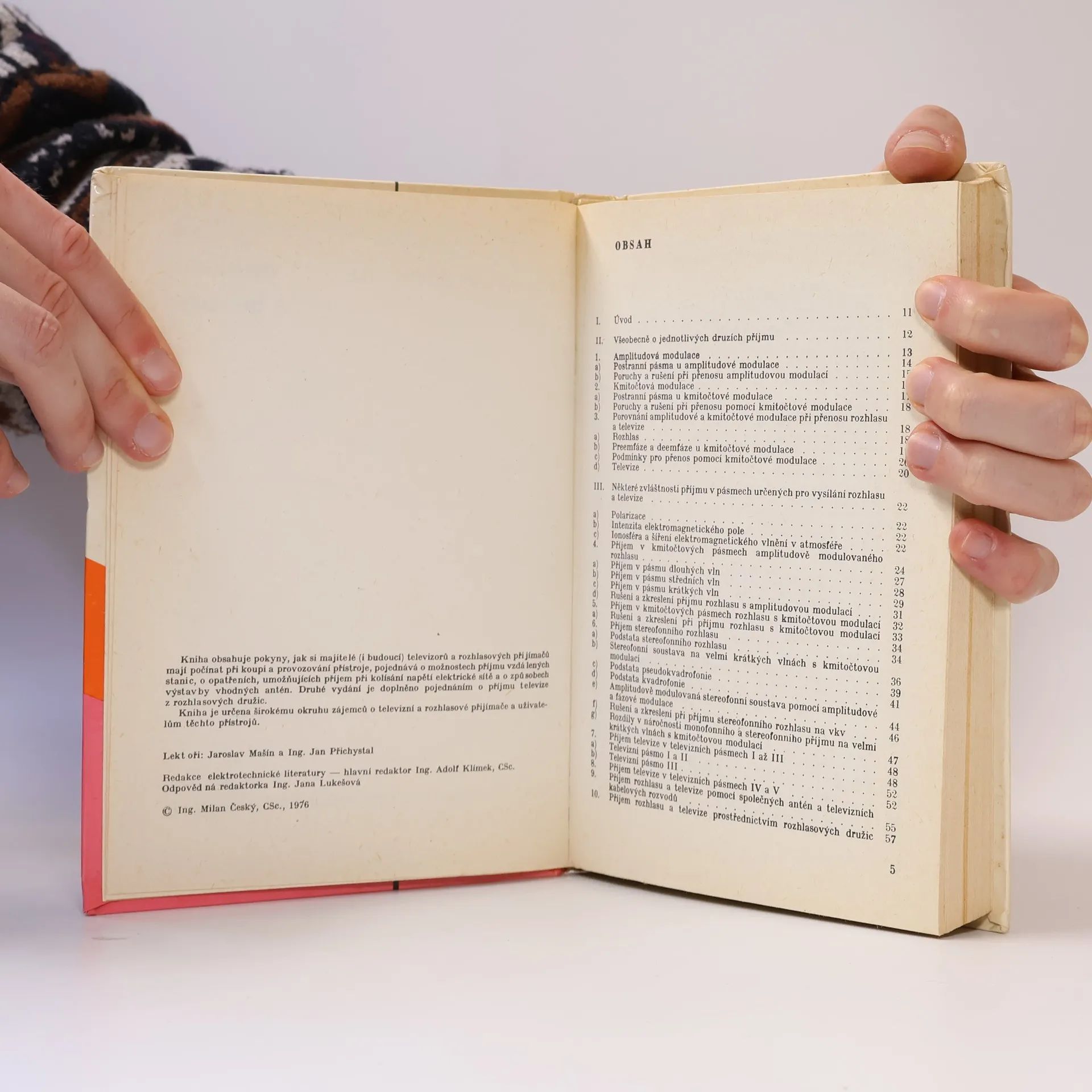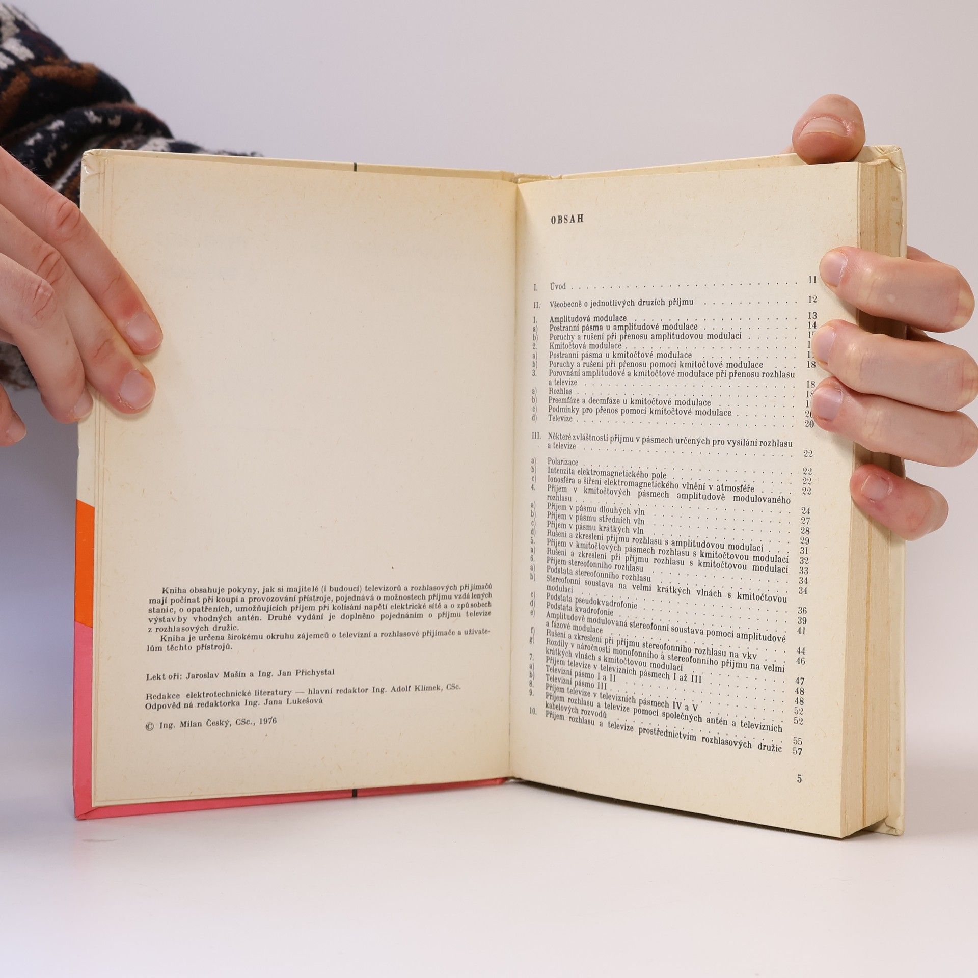 Autor informuje o některých zvláštnostech příjmu v pásmech určených pro vysílání rozhlasu a televize, radí při volbě vhodného přijímače, seznamuje s technikou rozhlasového a televizního příjmu a s účelnou stavbou a použitím antén pro televizní příjem. Zabývá se také příjmem televize v obtížných podmínkách, s předzesilovači, konvertory, společnými anténami a příjmem barevné televize.