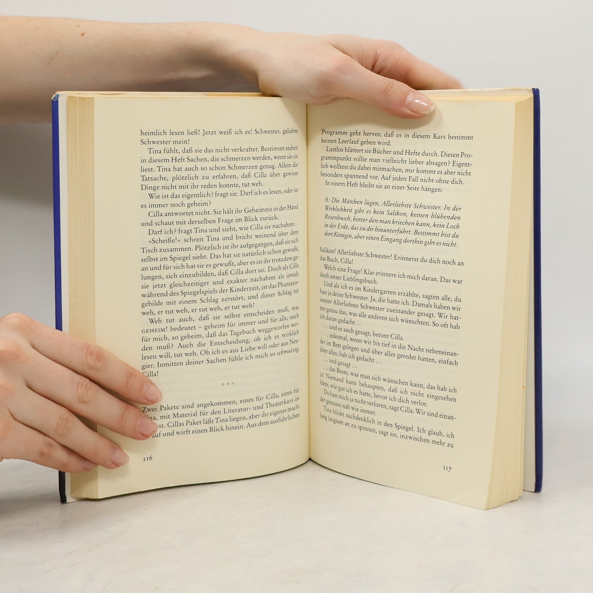 Für immer gibt es nicht. Cilla und Tina sind Zwillingsschwestern und unzertrennlich. Jede freie Minute verbringen sie zusammen. Kurz vor ihrem vierzehnten Geburtstag passiert das Schreckliche. Die beiden rennen dem wartenden Schulbus hinterher, es gibt einen riesigen Knall – und Cilla liegt leblos auf der Straße. Noch am gleichen Tag stirbt sie im Krankenhaus an den Folgen. Tina versteht nicht, was der Tod ihrer Schwester für sie bedeutet. Sie guckt in den Spiegel, sieht ihre Schwester und redet mit ihr. Tina hat Angst, verrückt zu werden. Ganz langsam beginnt Tina, ihren Weg alleine zu gehen.