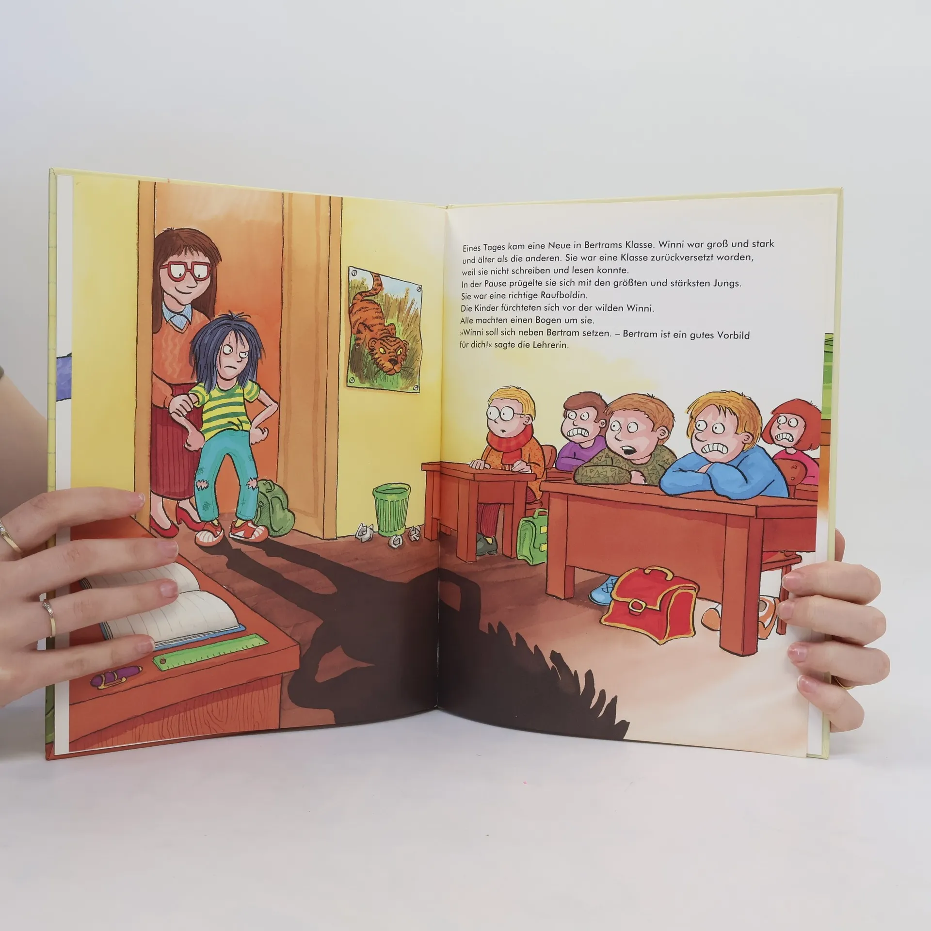 Bertram wird dank einer überfürsorglichen Mutter ein ordentlicher Schüler und Aussenseiter. Die wilde Winni, neu in der Klasse, ist ebenso unbeliebt. Als sich die beiden ungleichen Kinder anfreunden, ändert sich vieles. Der brave Bertram lernt Judo und gewinnt Selbstvertrauen, die Raufboldin Winni lernt Lesen und Schreiben und entdeckt, dass Schule auch Spass machen kann. Die Handlung birgt keine Spannung oder Überraschungen, Phantasie ist nicht gefragt. Es geht nicht ohne Klischees: Streber sind unbeliebt und tragen Brillen. Die Gesichter in den comicartigen Illustrationen sind ebensowenig individuell gestaltet wie die Charaktere. Dennoch ist die Geschichte einer Veränderung durch Freundschaft nicht ohne Charme. - In grösseren Beständen denkbar - ab 5 und für Erstleser/innen