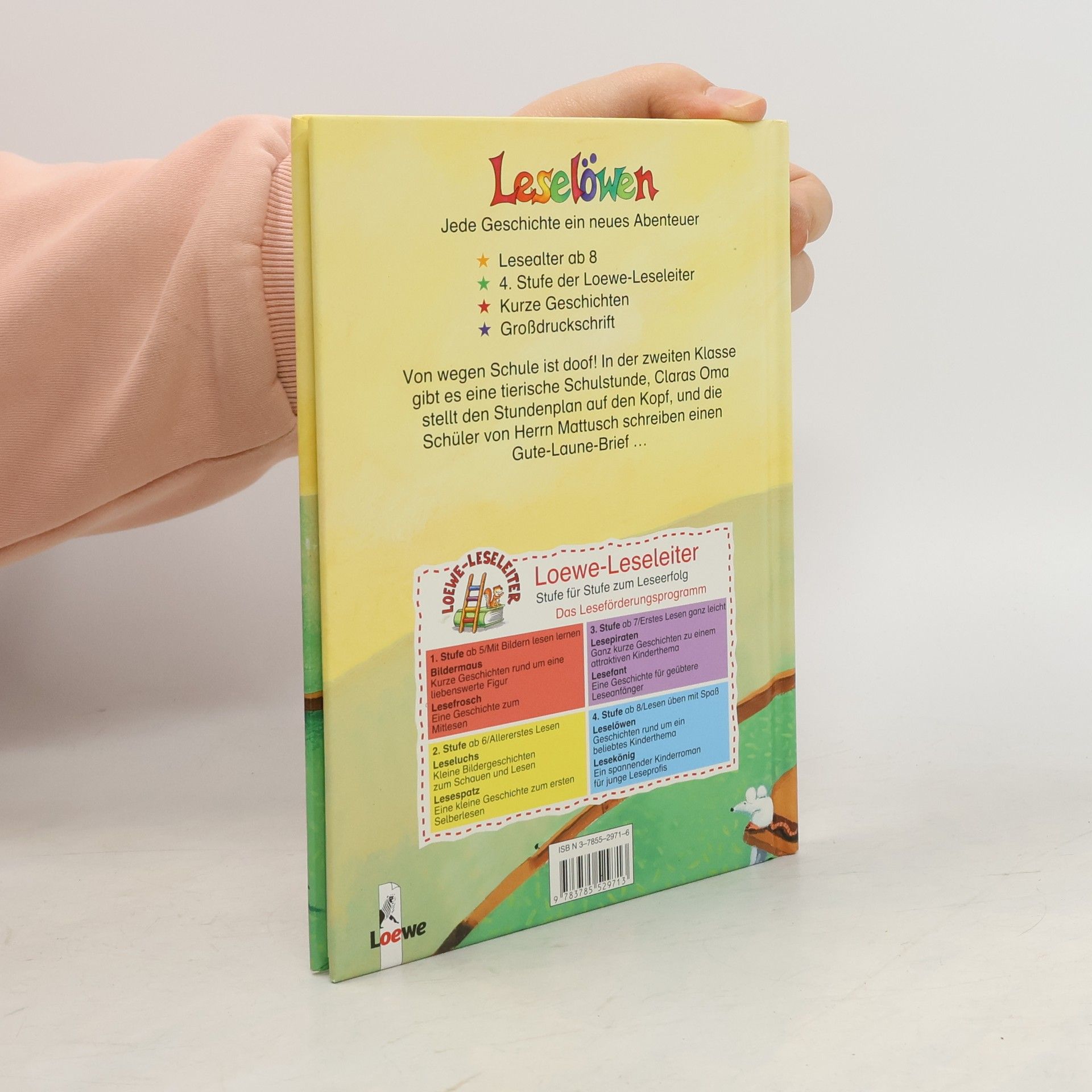 Lesealter ab 8 4. Stufe der Loewe-Leseleiter Kurze Geschichten Großdruckschrift Von wegen Schule ist doof! In der zweiten Klasse gibt es eine tierische Schulstunde, Claras Oma stellt den Stundenplan auf den Kopf und die Schüler von Herrn Mattusch schreiben einen Gute-Laune-Brief.