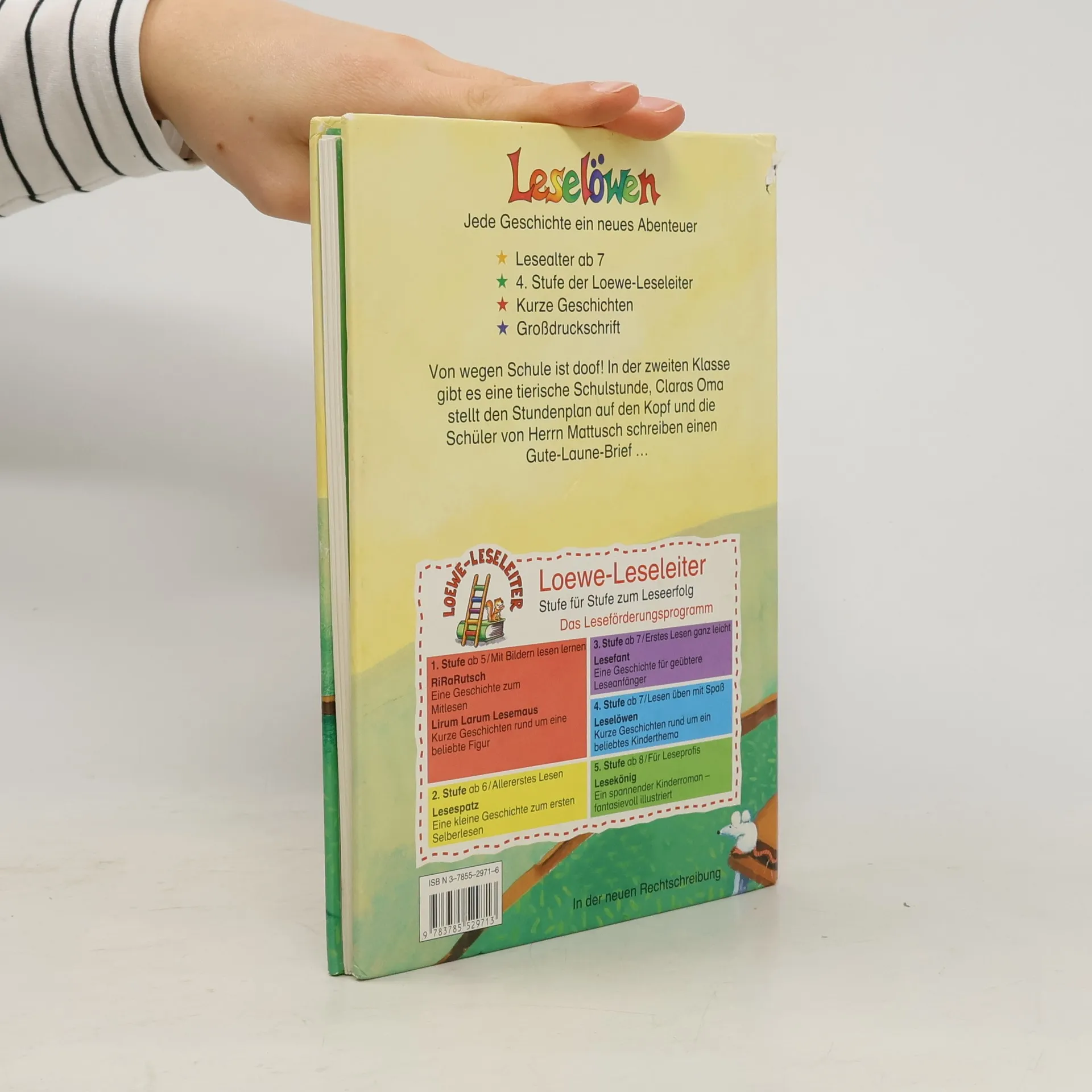 Lesealter ab 8 4. Stufe der Loewe-Leseleiter Kurze Geschichten Großdruckschrift Von wegen Schule ist doof! In der zweiten Klasse gibt es eine tierische Schulstunde, Claras Oma stellt den Stundenplan auf den Kopf und die Schüler von Herrn Mattusch schreiben einen Gute-Laune-Brief.
