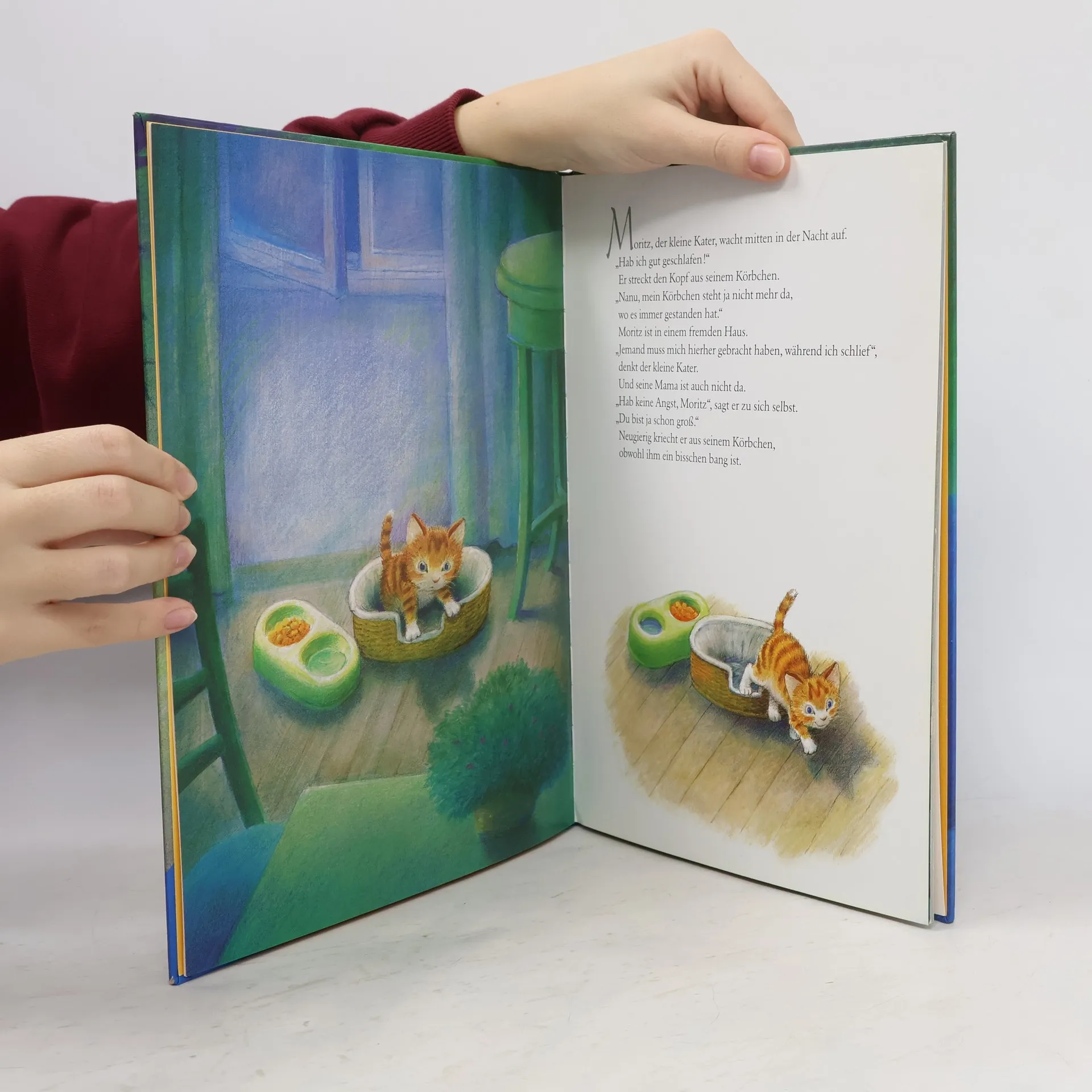Der rote Kater Moritz stellt mitten in der Nacht fest, dass man ihn weggegeben hat. Neugierig, aber auch ein wenig ängstlich sieht er sich in seinem neuen Zuhause um.